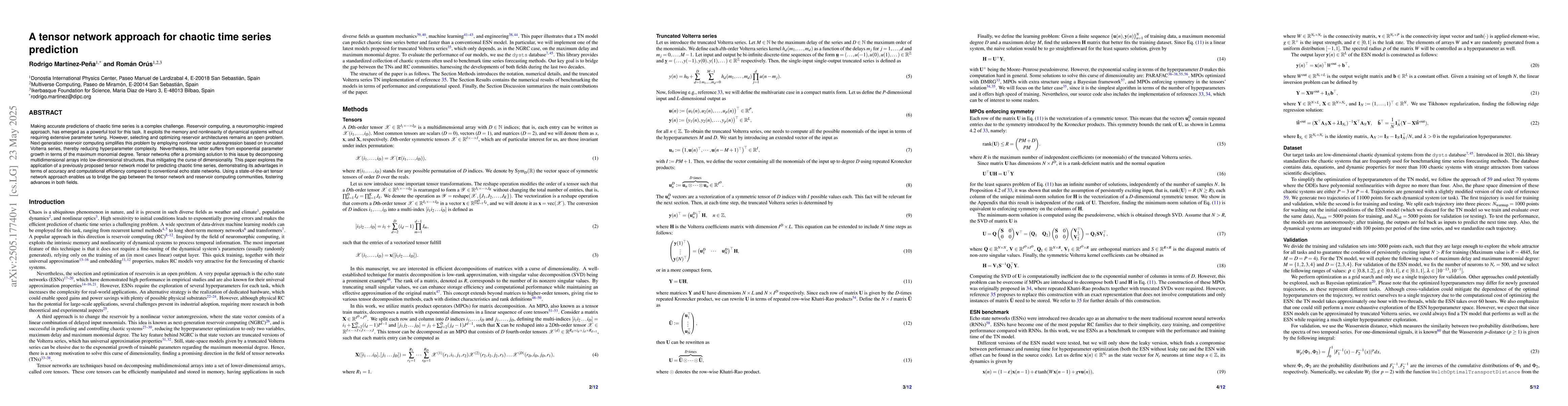 This paper explores a tensor network approach for predicting chaotic time series, demonstrating its advantages in accuracy and computational efficiency over conventional echo state networks.