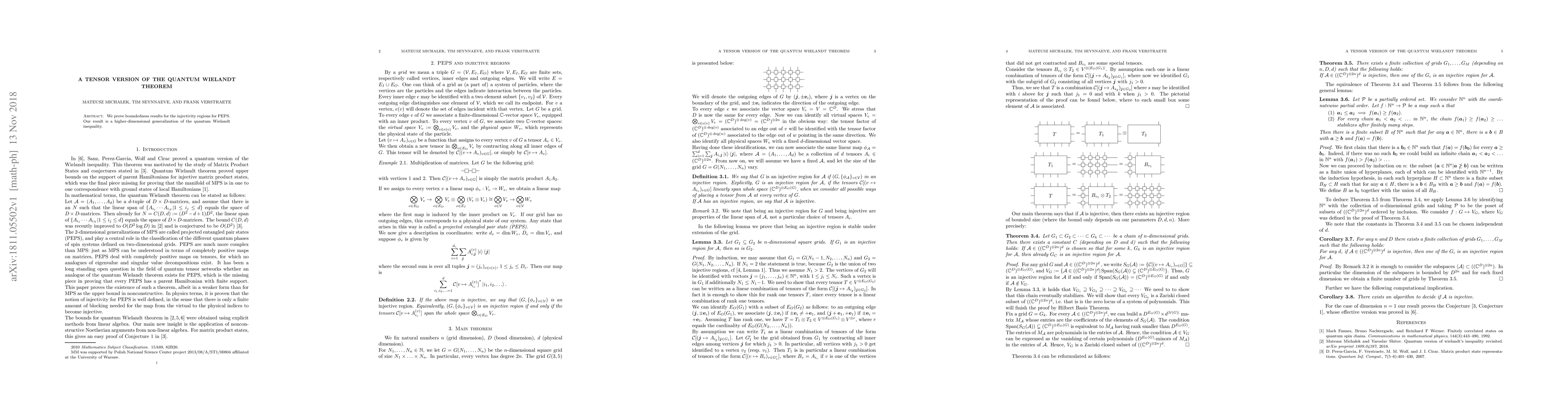 This paper presents a tensor extension of the quantum Wielandt theorem, demonstrating boundedness for the injectivity regions in Projected Entangled Pair States (PEPS). It generalizes the quantum Wielandt inequality into higher dimensions, offering significant implications for quantum many-body systems' theoretical understanding.