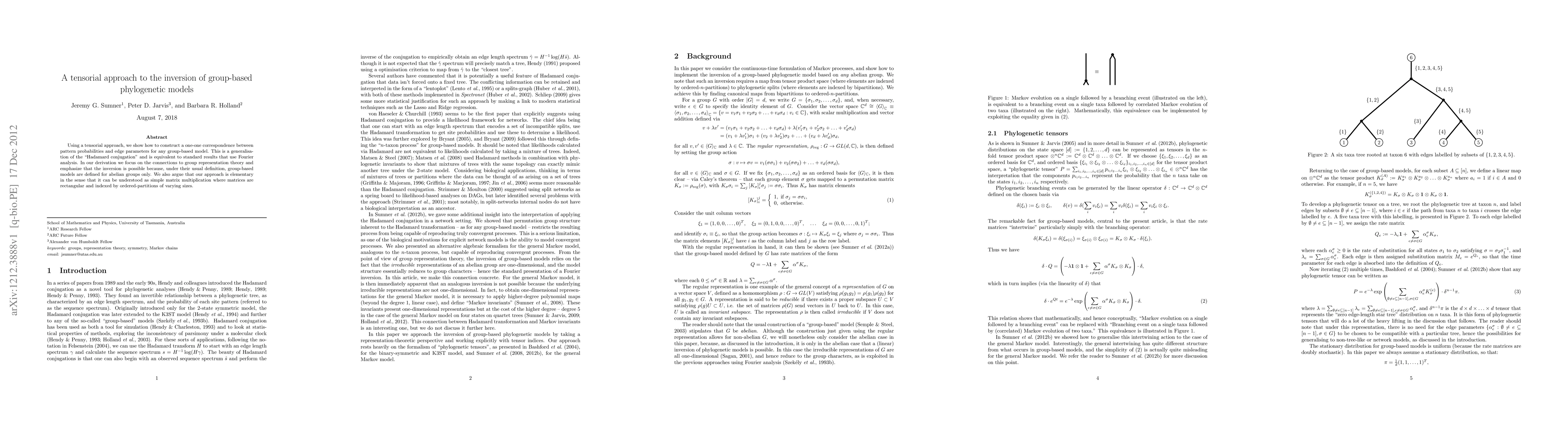 Using a tensorial approach, we show how to construct a one-one correspondence between pattern probabilities and edge parameters for any group-based model. This is a generalisation of the "Hadamard conjugation" and is equivalent to standard results that use Fourier analysis. In our derivation we focus on the connections to group representation theory and emphasize that the inversion is possible because, under their usual definition, group-based models are defined for abelian groups only. We also argue that our approach is elementary in the sense that it can be understood as simple matrix multiplication where matrices are rectangular and indexed by ordered-partitions of varying sizes.