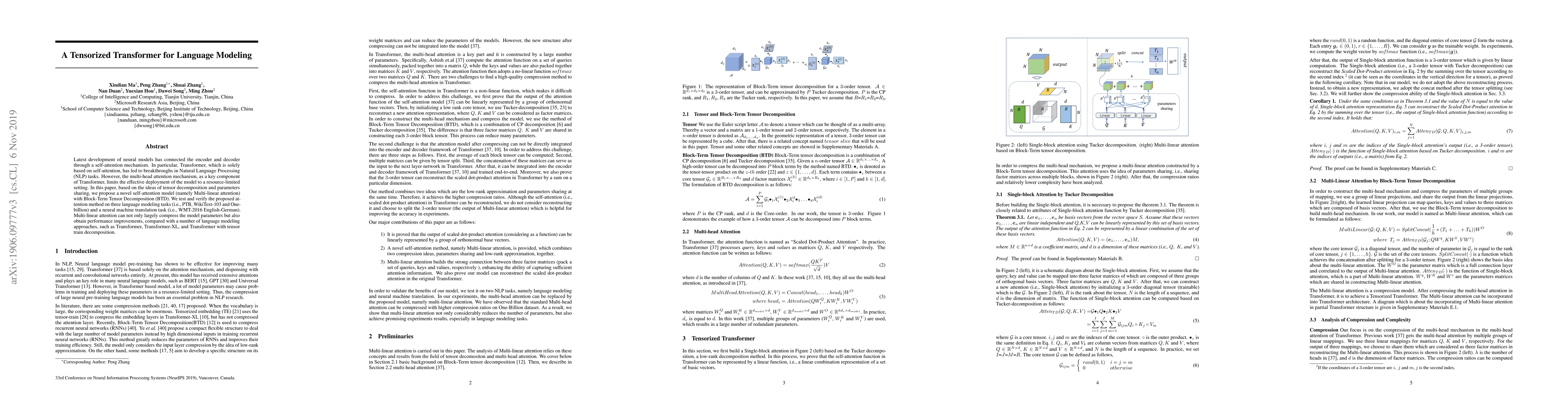 This paper proposes a novel Multi-linear attention model using Block-Term Tensor Decomposition to compress the parameters of the Transformer model, achieving both parameter reduction and performance improvements across various language modeling and translation tasks.