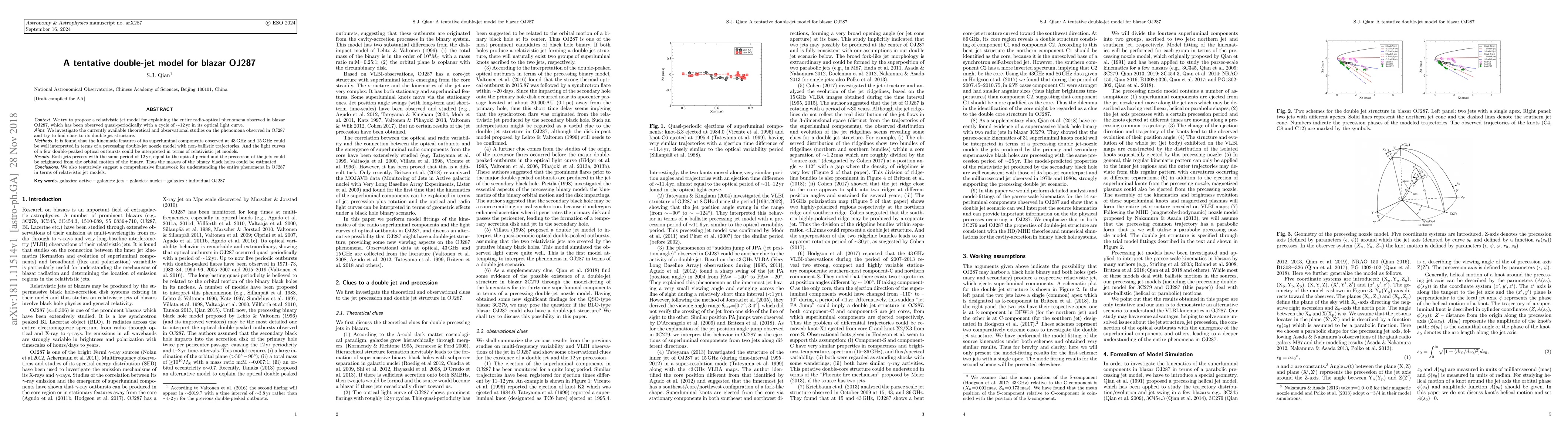 Researchers propose a double-jet model for blazar OJ287, suggesting that the object's 12-year cycle in optical light curves could be explained by precessing jets in a binary system, allowing for mass estimation of the black holes.