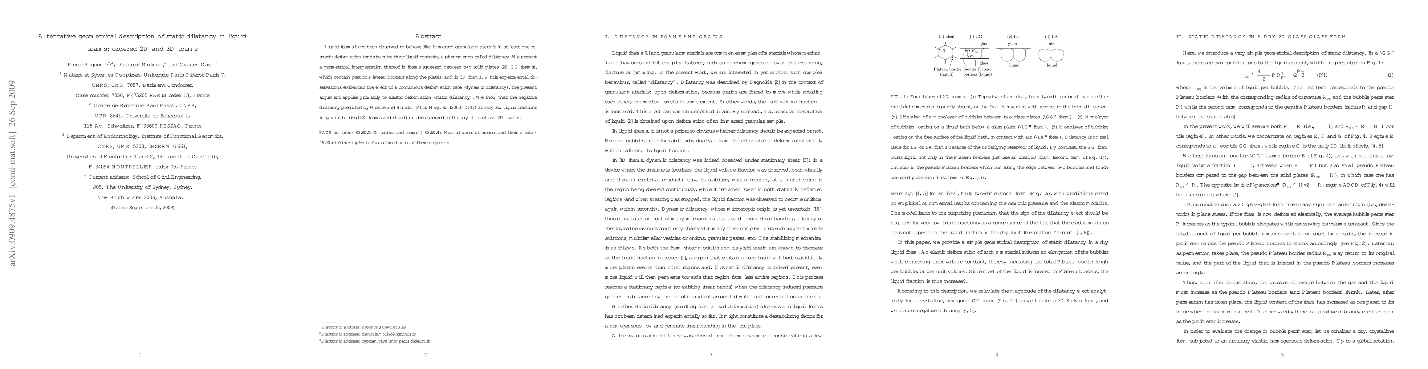 This paper proposes a geometrical interpretation of static dilatancy in liquid foams, showing that deformation raises liquid content. It contrasts static dilatancy in ordered 2D and 3D foams, noting that the negative dilatancy predicted by Weaire and Hutzler is specific to ideal 2D foams and not applicable to real 2D foams in the dry limit.