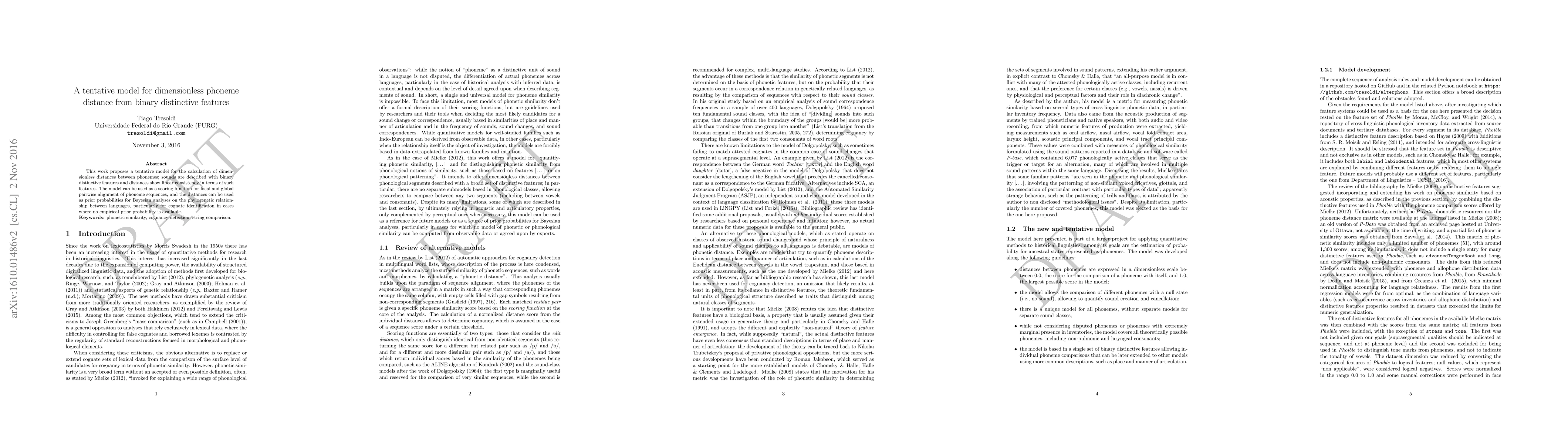 This work proposes a tentative model for the calculation of dimensionless distances between phonemes; sounds are described with binary distinctive features and distances show linear consistency in terms of such features. The model can be used as a scoring function for local and global pairwise alignment of phoneme sequences, and the distances can be used as prior probabilities for Bayesian analyses on the phylogenetic relationship between languages, particularly for cognate identification in cases where no empirical prior probability is available.