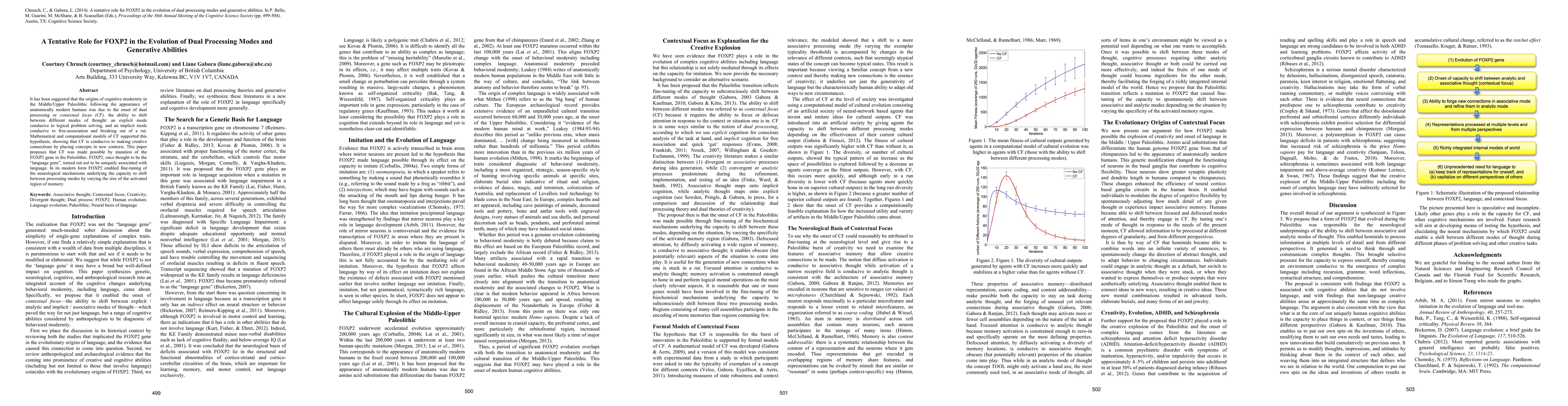 It has been suggested that the origins of cognitive modernity in the Middle/Upper Paleolithic following the appearance of anatomically modern humans was due to the onset of dual processing or contextual focus (CF), the ability to shift between different modes of thought: an explicit mode conducive to logical problem solving, and an implicit mode conducive to free-association and breaking out of a rut. Mathematical and computational models of CF supported this hypothesis, showing that CF is conducive to making creative connections by placing concepts in new contexts. This paper proposes that CF was made possible by mutation of the FOXP2 gene in the Paleolithic. FOXP2, once thought to be the 'language gene', turned out not to be uniquely associated with language. In its modern form FOXP2 enabled fine-tuning of the neurological mechanisms underlying the capacity to shift between processing modes by varying the size of the activated region of memory.