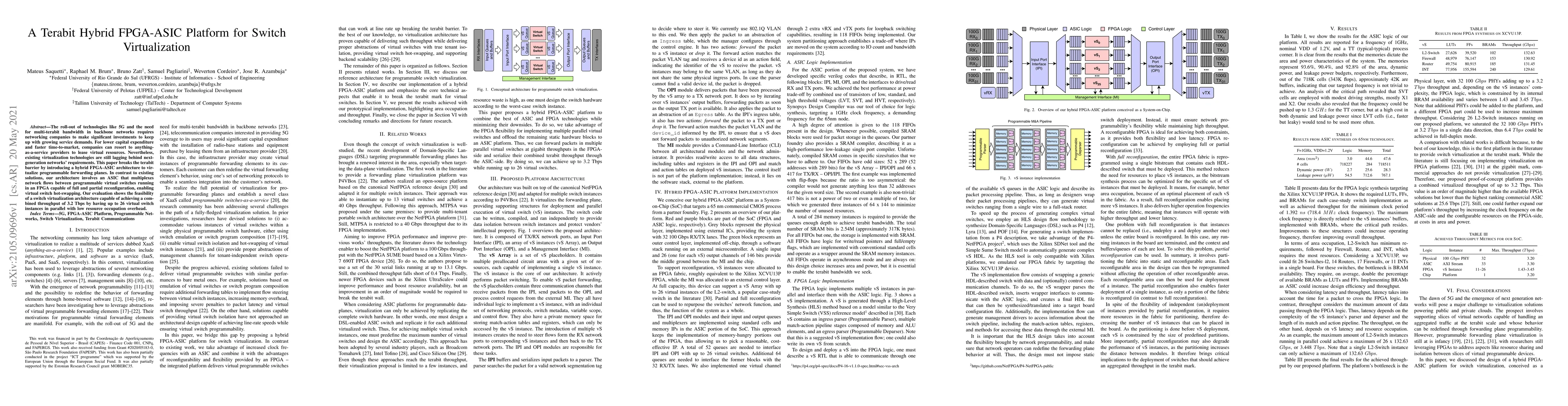 This paper introduces a hybrid FPGA-ASIC platform for switch virtualization that breaks the terabit barrier by achieving a combined throughput of 3.2 Tbps, enabling up to 26 virtual switch instances with minimal resource overhead. The architecture allows for flexible and efficient network flow management and virtual switch hot-swapping.