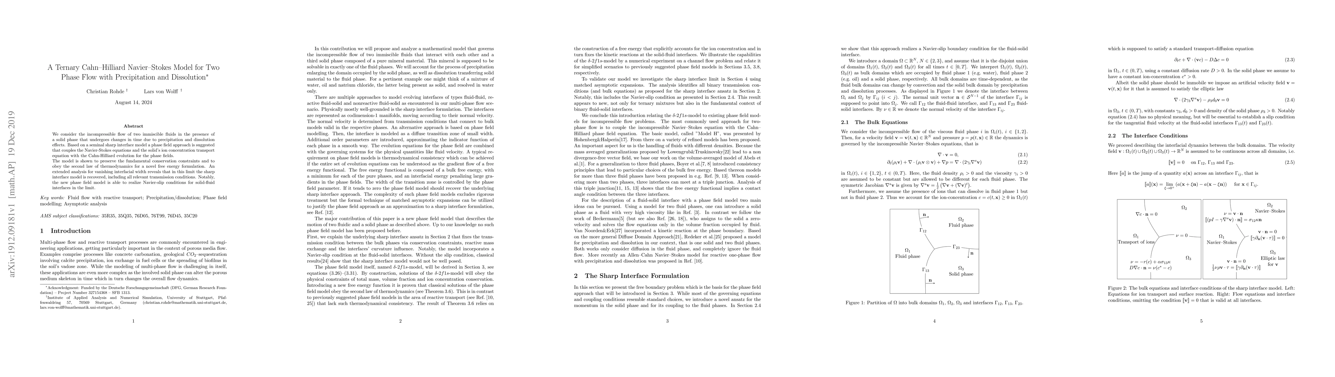 This paper proposes a ternary Cahn-Hilliard Navier-Stokes model for two-phase flow involving precipitation and dissolution, coupling Navier-Stokes equations with phase field dynamics and solid ion transport. The model maintains conservation laws and thermodynamic consistency, and reduces to the sharp interface model in the limit of vanishing interfacial width.