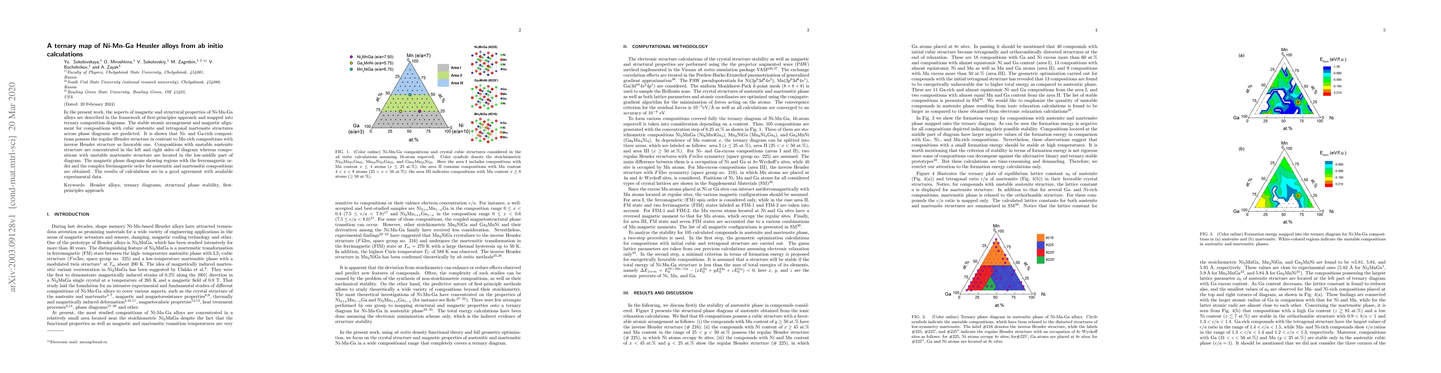 This study utilizes ab initio calculations to map the magnetic and structural properties of Ni-Mn-Ga Heusler alloys in ternary composition diagrams, revealing that Ni- and Ga-rich compositions favor the regular Heusler structure while Mn-rich compositions prefer the inverse Heusler structure. The diagrams also predict ferromagnetic and complex ferrimagnetic regions, aligning well with experimental data.