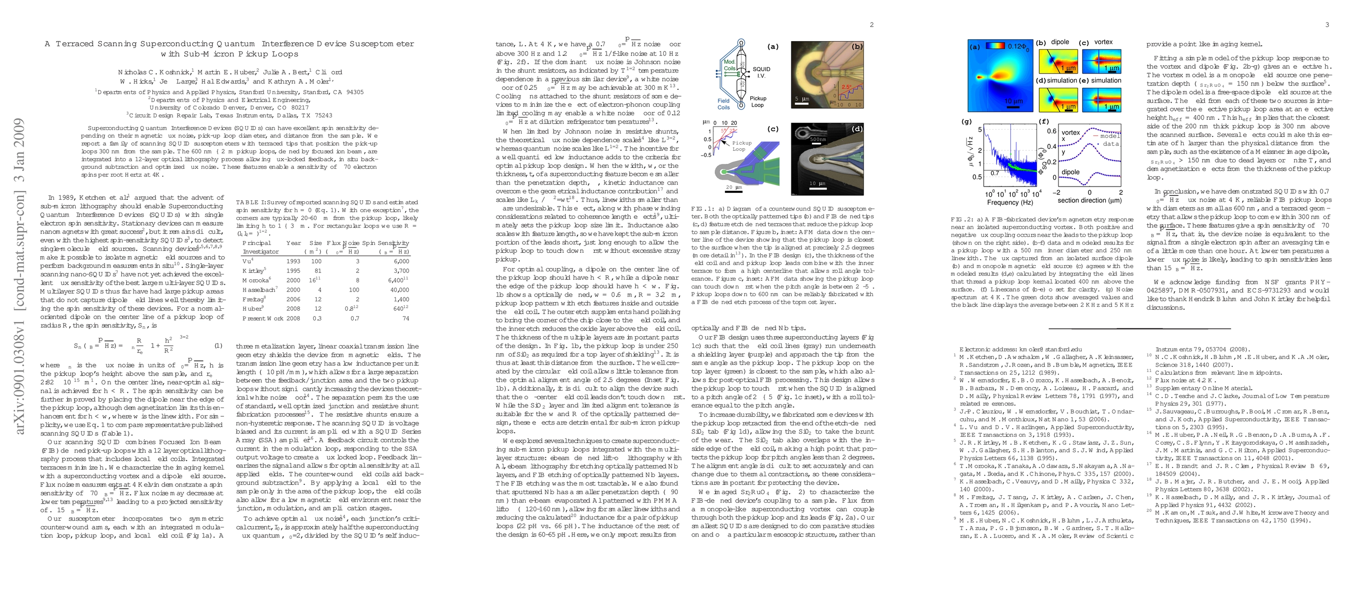 This paper presents a scanning SQUID susceptometer with terraced tips featuring sub-micron pickup loops, achieving a sensitivity of ~70 electron spins per root Hertz at 4K. The design integrates 600 nm - 2 µm loops via focused ion beam into a 12-layer optical lithography process, enabling flux-locked feedback and optimized flux noise.