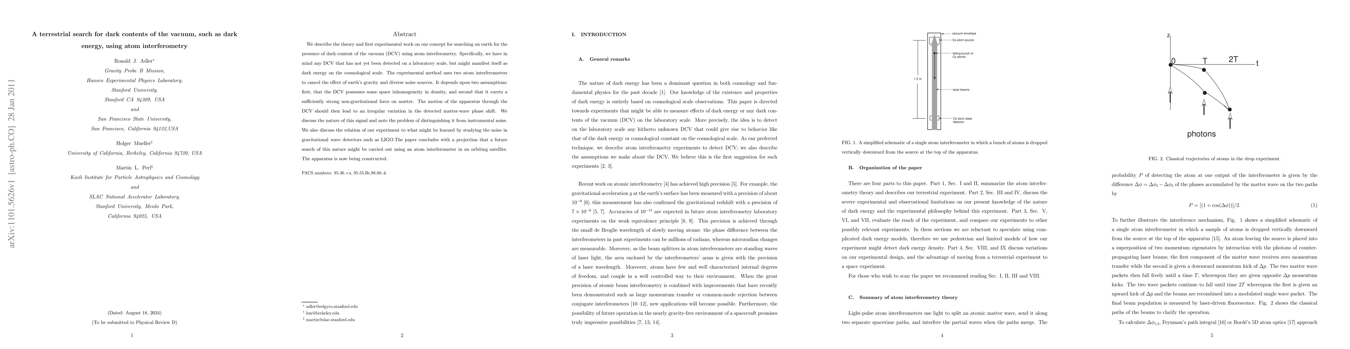 We describe the theory and first experimental work on our concept for searching on earth for the presence of dark content of the vacuum (DCV) using atom interferometry. Specifically, we have in mind any DCV that has not yet been detected on a laboratory scale, but might manifest itself as dark energy on the cosmological scale. The experimental method uses two atom interferometers to cancel the effect of earth's gravity and diverse noise sources. It depends upon two assumptions: first, that the DCV possesses some space inhomogeneity in density, and second that it exerts a sufficiently strong non-gravitational force on matter. The motion of the apparatus through the DCV should then lead to an irregular variation in the detected matter-wave phase shift. We discuss the nature of this signal and note the problem of distinguishing it from instrumental noise. We also discuss the relation of our experiment to what might be learned by studying the noise in gravitational wave detectors such as LIGO.The paper concludes with a projection that a future search of this nature might be carried out using an atom interferometer in an orbiting satellite. The apparatus is now being constructed.