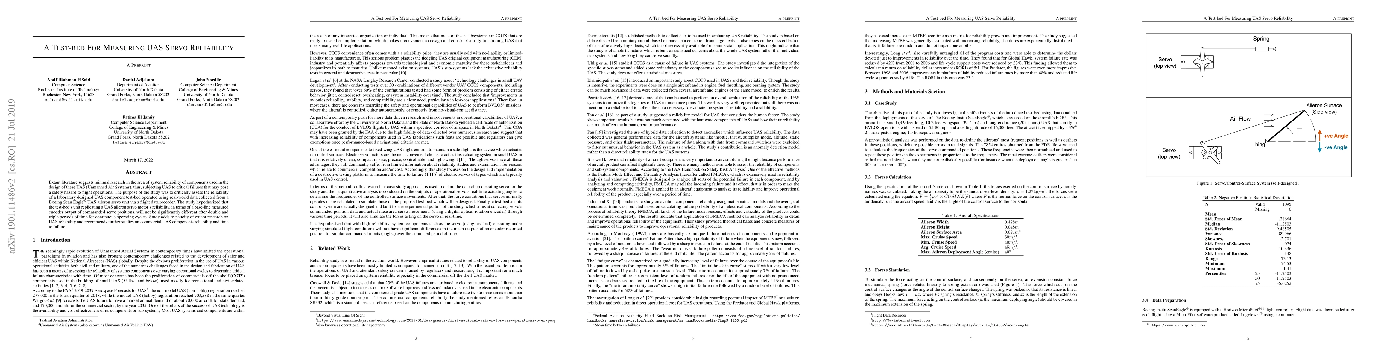 Extant literature suggests minimal research in the area of system reliability of components used in the design of these UAS (Unmanned Air Systems), thus, subjecting UAS to critical failures that may pose a safety hazard to flight operations. The purpose of the study was to critically assess the reliability of a laboratory designed UAS component test-bed operated using real-world data collected from a Boeing Scan Eagle UAS aileron servo unit via a flight data recorder. The study hypothesized that the test-bed unit's replicating a UAS aileron servo motor's reliability, in terms of a base-line measured encoder output of commanded servo positions, will not be significantly different after double and triple periods of time for continuous operating cycles. Study adds to paucity of extant research on UAS reliability and recommends further studies on commercial UAS components reliability and time to failure.