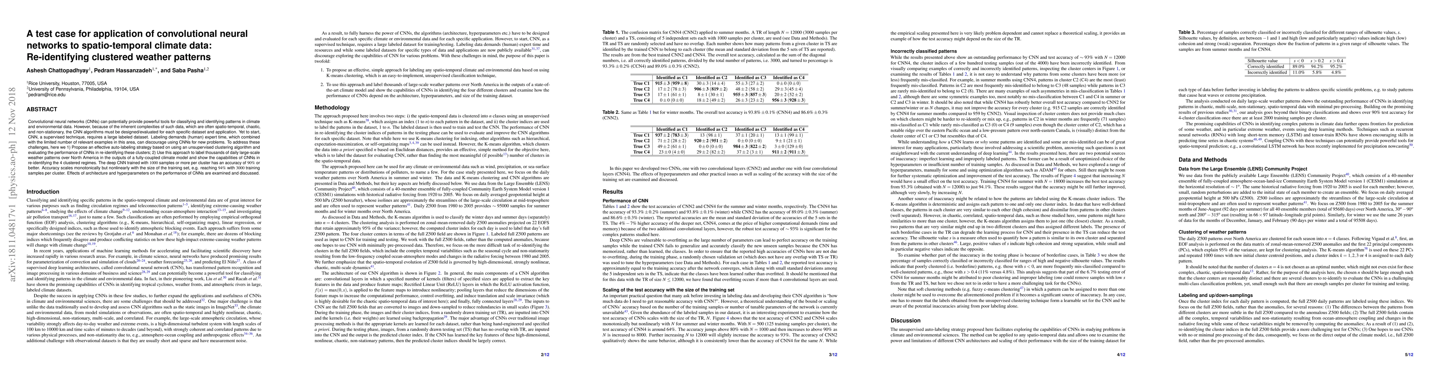 Convolutional neural networks (CNNs) can potentially provide powerful tools for classifying and identifying patterns in climate and environmental data. However, because of the inherent complexities of such data, which are often spatio-temporal, chaotic, and non-stationary, the CNN algorithms must be designed/evaluated for each specific dataset and application. Yet to start, CNN, a supervised technique, requires a large labeled dataset. Labeling demands (human) expert time, which combined with the limited number of relevant examples in this area, can discourage using CNNs for new problems. To address these challenges, here we (1) Propose an effective auto-labeling strategy based on using an unsupervised clustering algorithm and evaluating the performance of CNNs in re-identifying these clusters; (2) Use this approach to label thousands of daily large-scale weather patterns over North America in the outputs of a fully-coupled climate model and show the capabilities of CNNs in re-identifying the 4 clustered regimes. The deep CNN trained with $1000$ samples or more per cluster has an accuracy of $90\%$ or better. Accuracy scales monotonically but nonlinearly with the size of the training set, e.g. reaching $94\%$ with $3000$ training samples per cluster. Effects of architecture and hyperparameters on the performance of CNNs are examined and discussed.