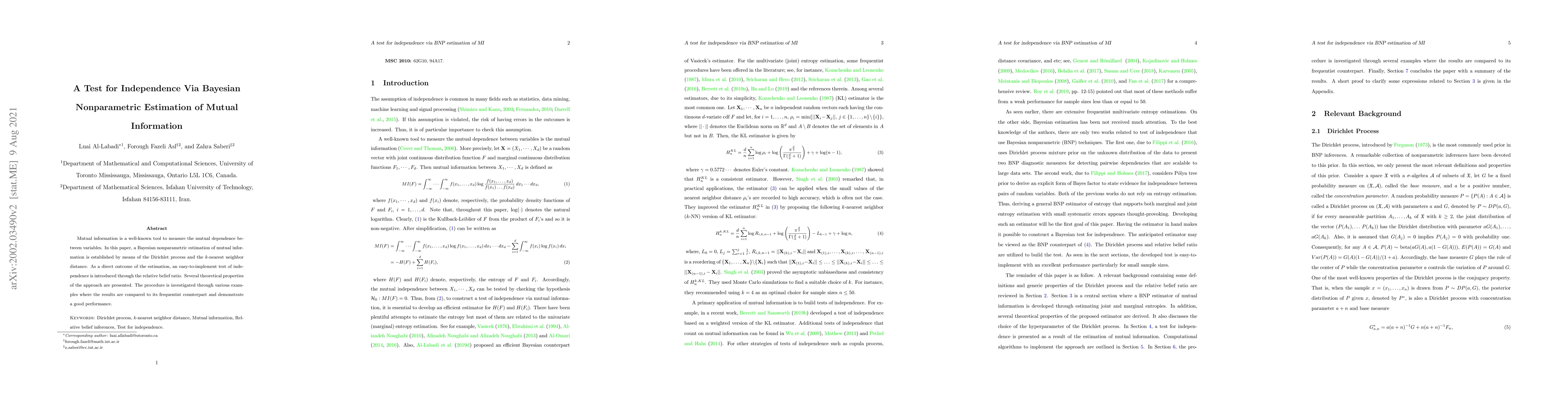 This paper proposes a Bayesian nonparametric method using the Dirichlet process and $k$-nearest neighbor distance to estimate mutual information, leading to a straightforward independence test via the relative belief ratio. The method's performance is compared to frequentist methods and shows promising results.