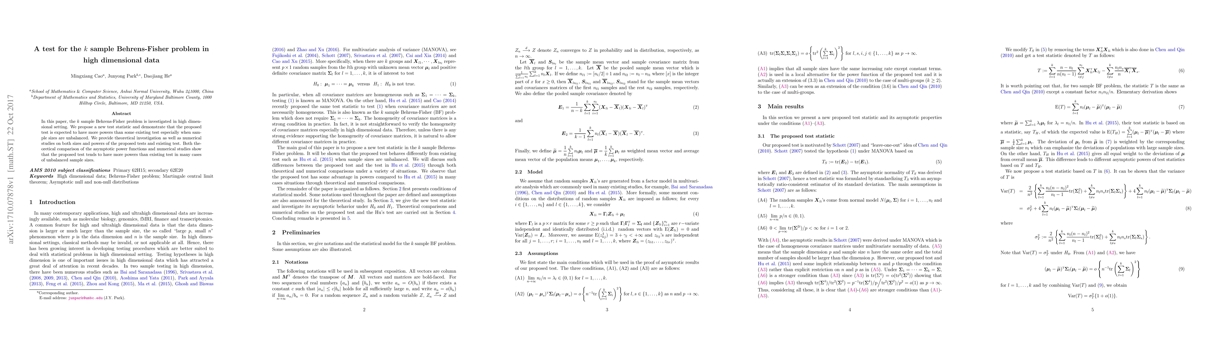 A new test statistic is proposed to tackle the k sample Behrens-Fisher problem in high-dimensional data, showing it often outperforms existing tests, especially with unbalanced sample sizes.
