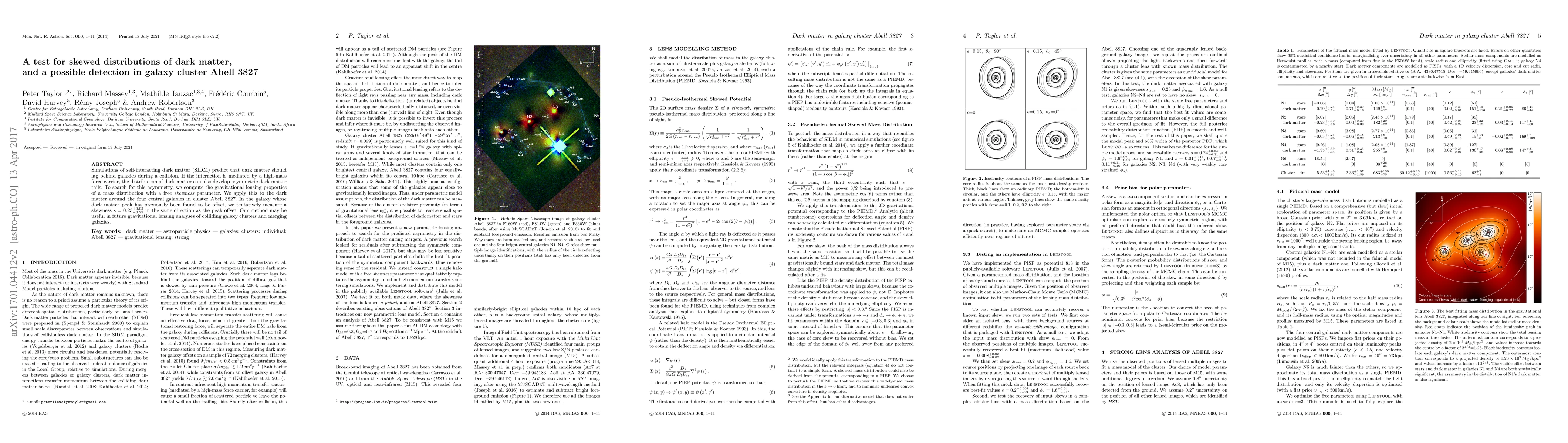 This study tests for skewed distributions of dark matter in galaxy cluster Abell 3827 using gravitational lensing, finding a tentative skewness in the dark matter around one central galaxy, suggesting possible tails in the dark matter distribution. The method may aid future analyses of dark matter in colliding galaxy clusters.