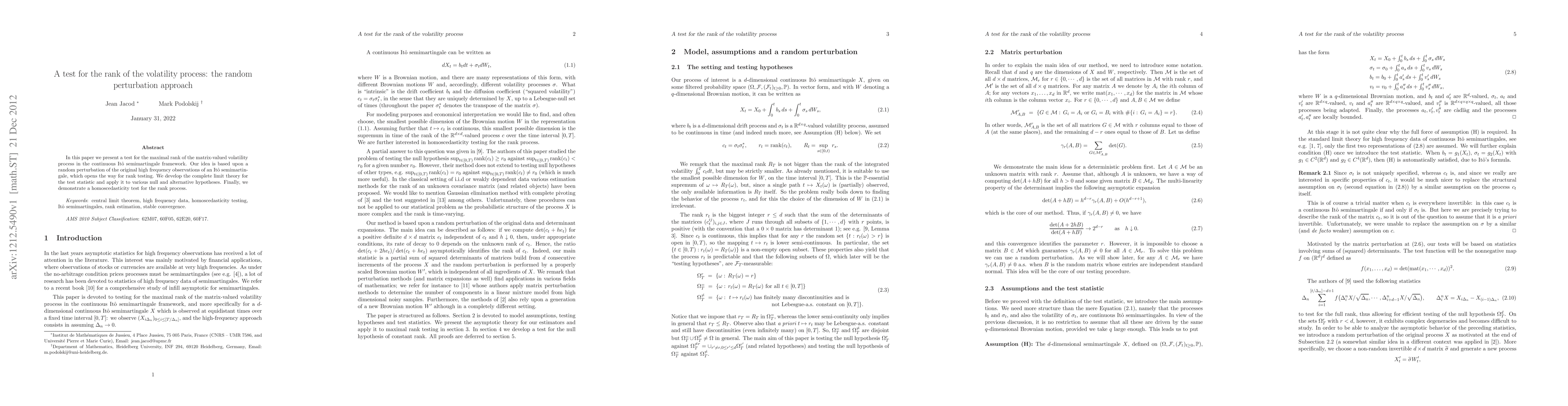 In this paper we present a test for the maximal rank of the matrix-valued volatility process in the continuous Ito semimartingale framework. Our idea is based upon a random perturbation of the original high frequency observations of an Ito semimartingale, which opens the way for rank testing. We develop the complete limit theory for the test statistic and apply it to various null and alternative hypotheses. Finally, we demonstrate a homoscedasticity test for the rank process.