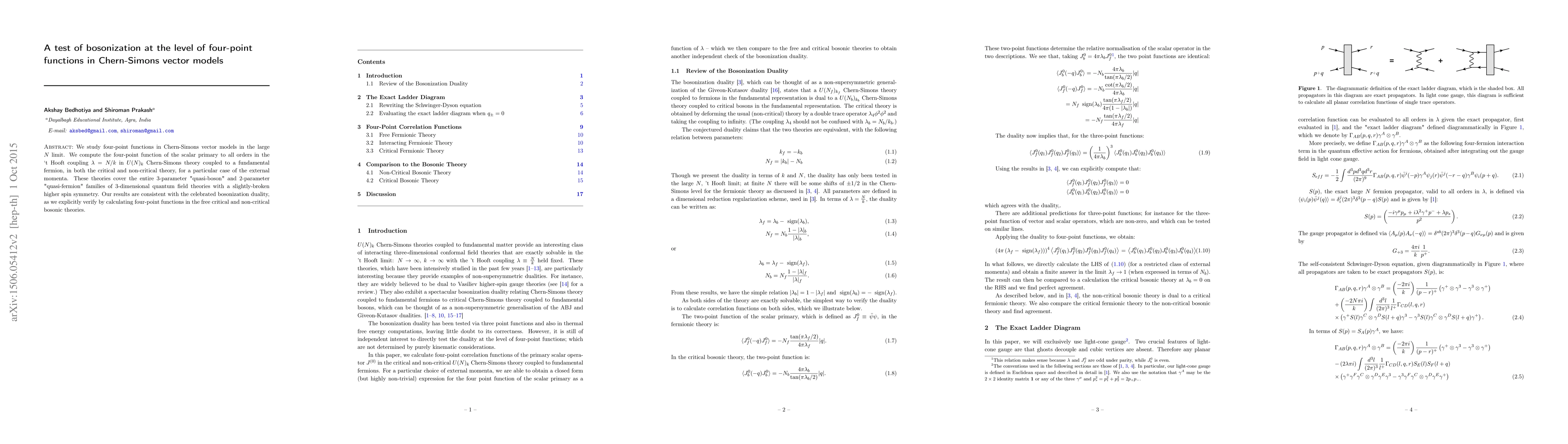 We study four-point functions in Chern-Simons vector models in the large $N$ limit. We compute the four-point function of the scalar primary to all orders in the `t Hooft coupling $\lambda=N/k$ in $U(N)_k$ Chern-Simons theory coupled to a fundamental fermion, in both the critical and non-critical theory, for a particular case of the external momenta. These theories cover the entire 3-parameter "quasi-boson" and 2-parameter "quasi-fermion" families of 3-dimensional quantum field theories with a slightly-broken higher spin symmetry. Our results are consistent with the celebrated bosonization duality, as we explicitly verify by calculating four-point functions in the free critical and non-critical bosonic theories.