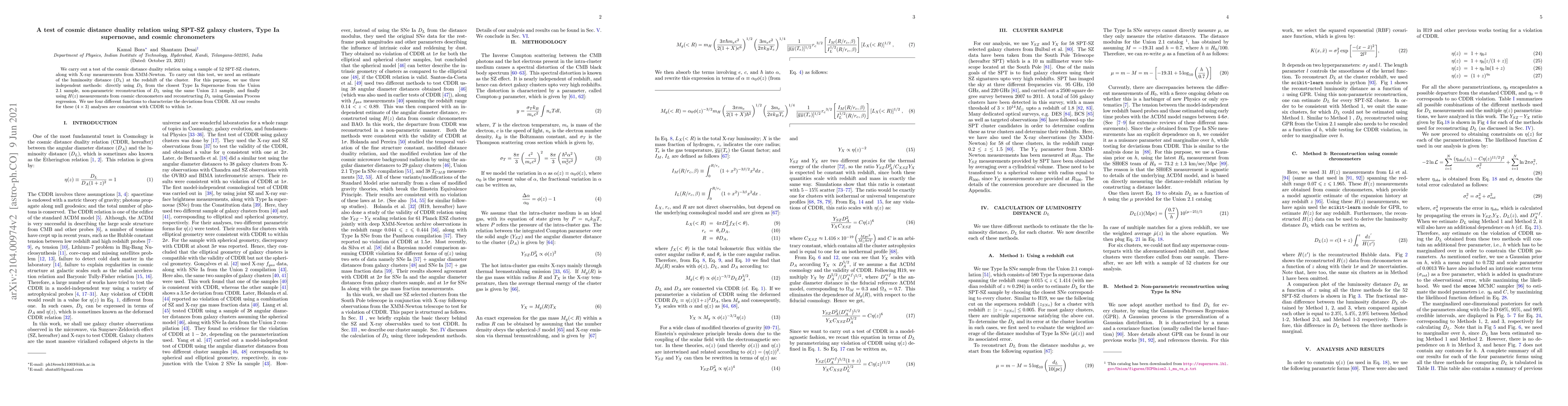 This paper tests the cosmic distance duality relation (CDDR) using 52 SPT-SZ galaxy clusters and three independent methods: Type Ia supernovae, non-parametric reconstruction, and cosmic chronometers. Results from all methods are consistent with CDDR within 1σ.