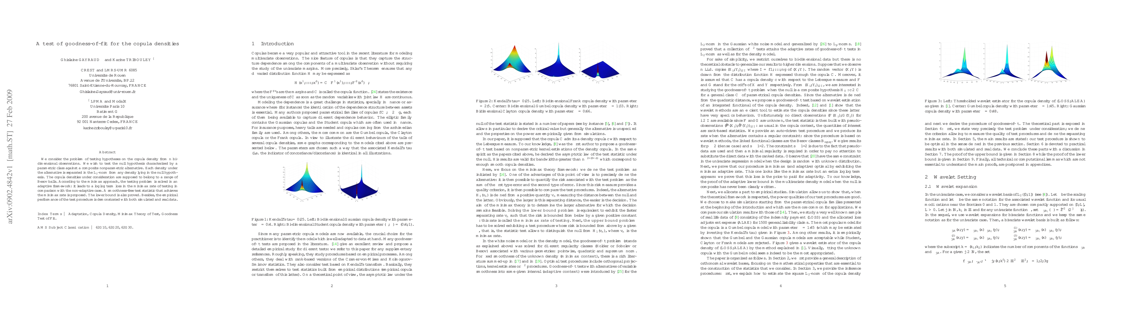 The paper addresses the problem of testing hypotheses on copula densities using bi-dimensional observations. It considers a parametric class under the null hypothesis against a composite nonparametric alternative, where each density under the alternative is separated in the L2-norm from any density in the null hypothesis. The copula densities are assumed to belong to Besov balls.