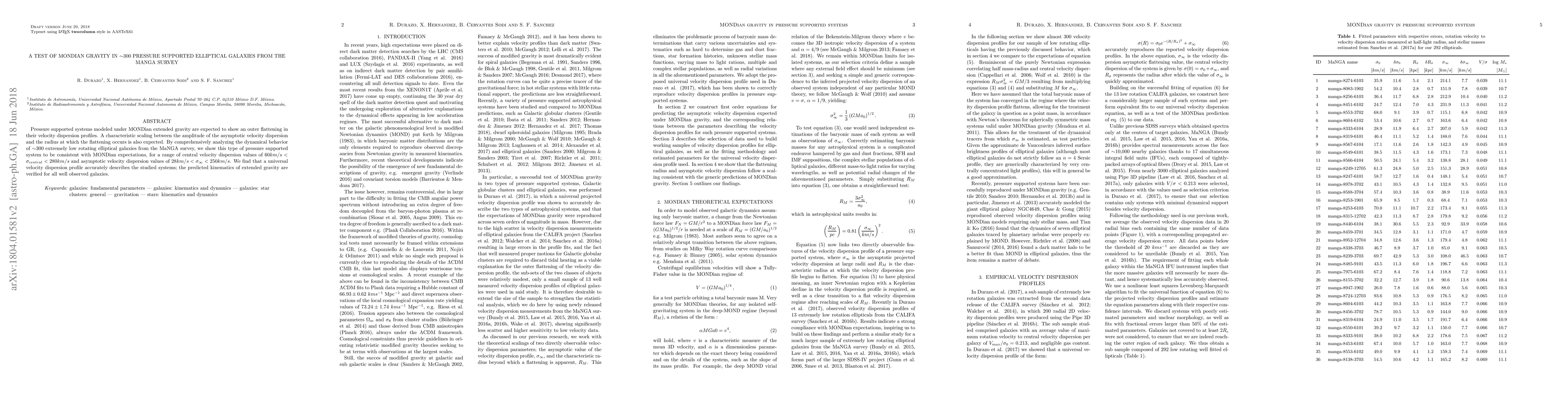 Pressure supported systems modeled under MONDian extended gravity are expected to show an outer flattening in their velocity dispersion profiles. A characteristic scaling between the amplitude of the asymptotic velocity dispersion and the radius at which the flattening occurs is also expected. By comprehensively analyzing the dynamical behavior of $\sim$300 extremely low rotating elliptical galaxies from the MaNGA survey, we show this type of pressure supported systems to be consistent with MONDian expectations, for a range of central velocity dispersion values of $60 km/s < \sigma_{central}< 280 km/s $ and asymptotic velocity dispersion values of $28km/s < \sigma_{\infty}<250 km/s$. We find that a universal velocity dispersion profile accurately describes the studied systems; the predicted kinematics of extended gravity are verified for all well observed galaxies.