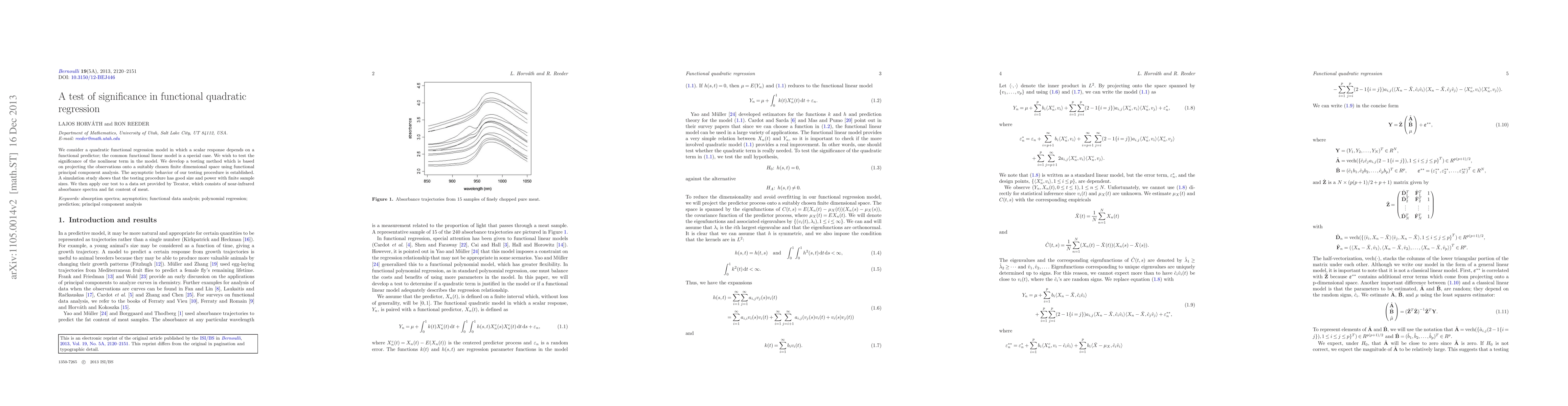 This paper develops a testing method for the significance of the nonlinear term in a quadratic functional regression model, utilizing functional principal component analysis for projection. Simulation results show the method's good size and power, and it is applied to Tecator data linking near-infrared absorbance spectra to meat fat content.