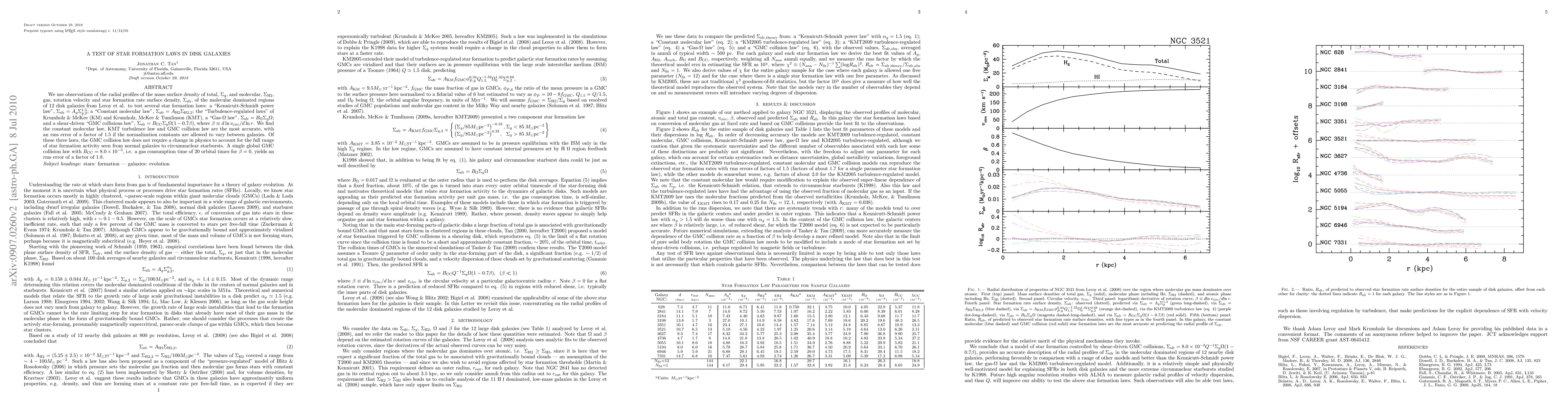 This study tests various star formation laws in disk galaxies using observational data from 12 galaxies, finding that the GMC collision law provides the most accurate description of star formation rates, requiring no change in physics to explain diverse star formation activities. The constant molecular law, KMT turbulence law, and GMC collision law show the best fit with an rms error of 1.5 when normalization constants vary.