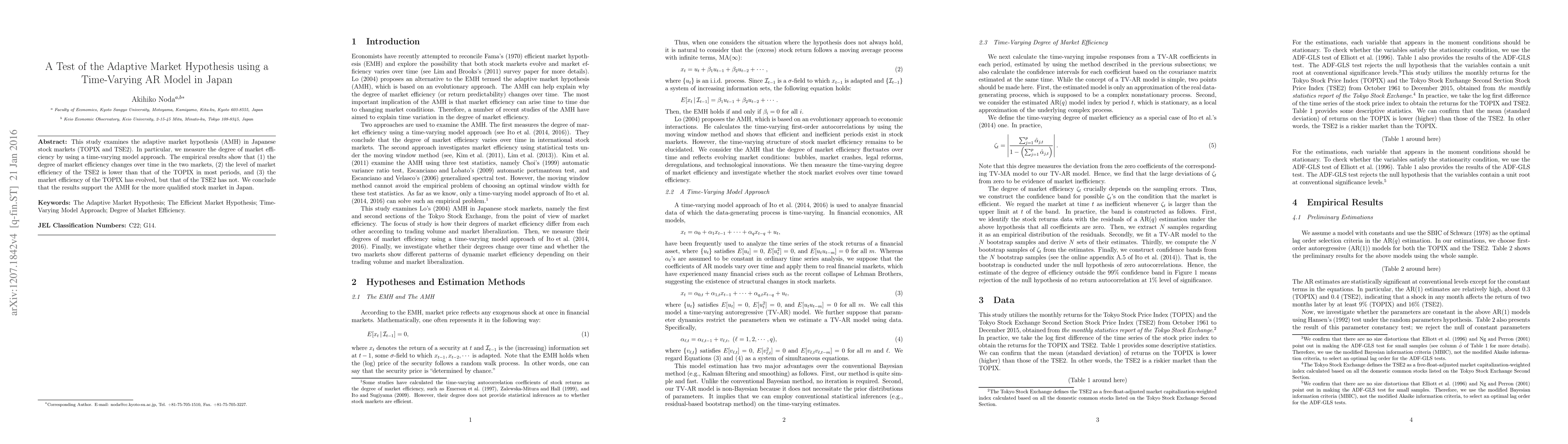 This study tests the adaptive market hypothesis in Japanese stock markets using a time-varying AR model, finding that market efficiency varies over time and is generally higher in the TOPIX than in the TSE2, supporting the AMH for the more efficient market.