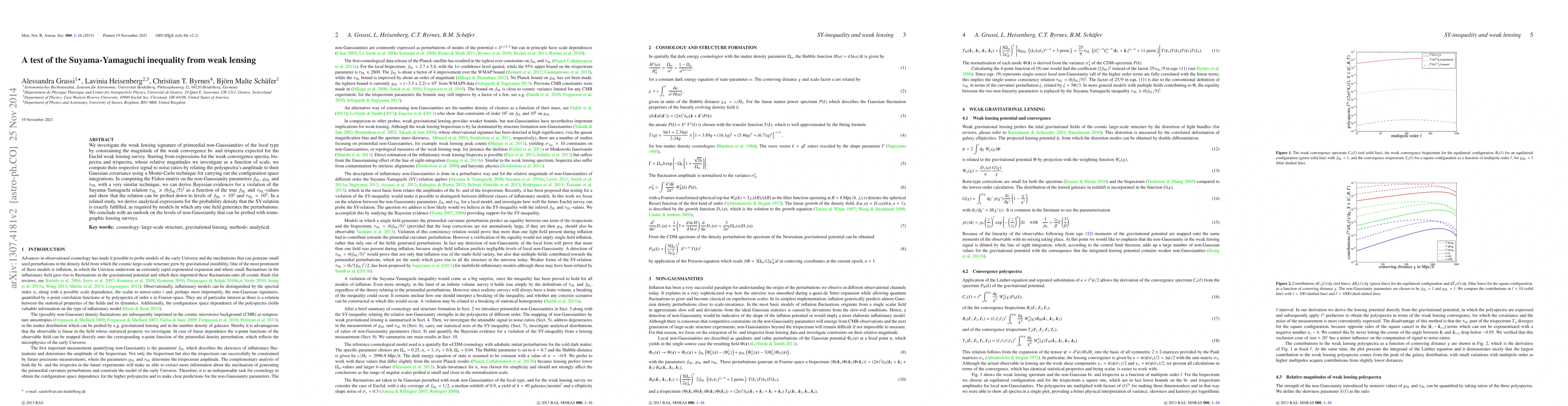 We investigate the weak lensing signature of primordial non-Gaussianities of the local type by constraining the magnitude of the weak convergence bi- and trispectra expected for the EUCLID weak lensing survey. Starting from expressions for the weak convergence spectra, bispectra and trispectra, whose relative magnitudes we investigate as a function of scale, we compute their respective signal to noise ratios by relating the polyspectra's amplitude to their Gaussian covariance using a Monte-Carlo technique for carrying out the configuration space integrations. In computing the Fisher-matrix on the non-Gaussianity parameters f_nl, g_nl and tau_nl with a very similar technique, we can derive Bayesian evidences for a violation of the Suyama-Yamaguchi relation tau_nl>=(6 f_nl/5)^2 as a function of the true f_nl and tau_nl-values and show that the relation can be probed down to levels of f_nl~10^2 and tau_nl~10^5. In a related study, we derive analytical expressions for the probability density that the SY-relation is exactly fulfilled, as required by models in which any one field generates the perturbations. We conclude with an outlook on the levels of non-Gaussianity that can be probed with tomographic lensing surveys.