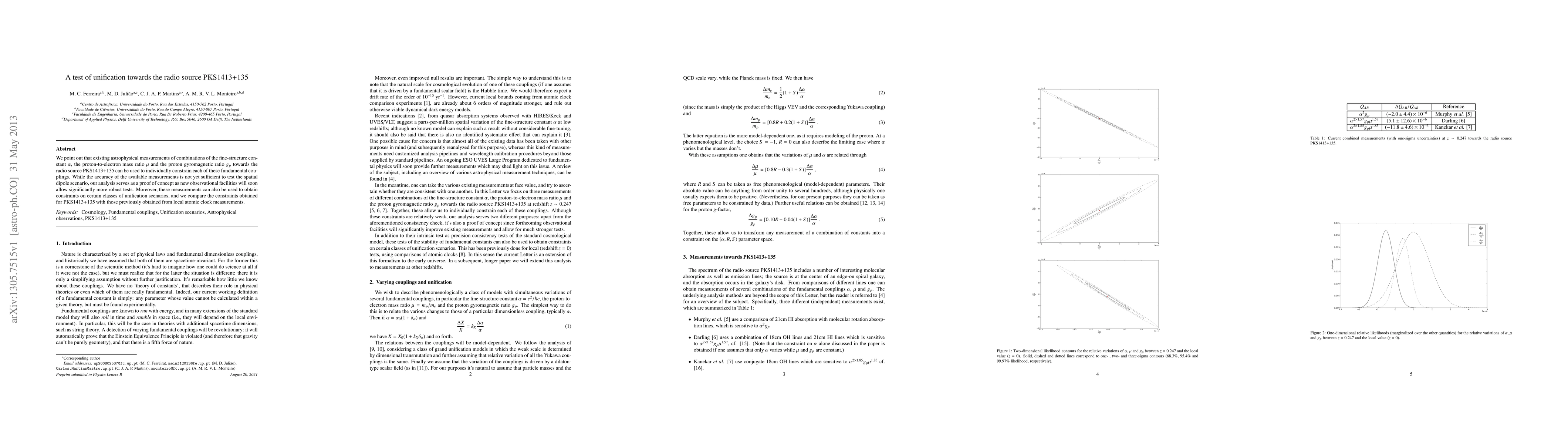 We point out that existing astrophysical measurements of combinations of the fine-structure constant $\alpha$, the proton-to-electron mass ratio $\mu$ and the proton gyromagnetic ratio $g_p$ towards the radio source PKS1413+135 can be used to individually constrain each of these fundamental couplings. While the accuracy of the available measurements is not yet sufficient to test the spatial dipole scenario, our analysis serves as a proof of concept as new observational facilities will soon allow significantly more robust tests. Moreover, these measurements can also be used to obtain constraints on certain classes of unification scenarios, and we compare the constraints obtained for PKS1413+135 with those previously obtained from local atomic clock measurements.