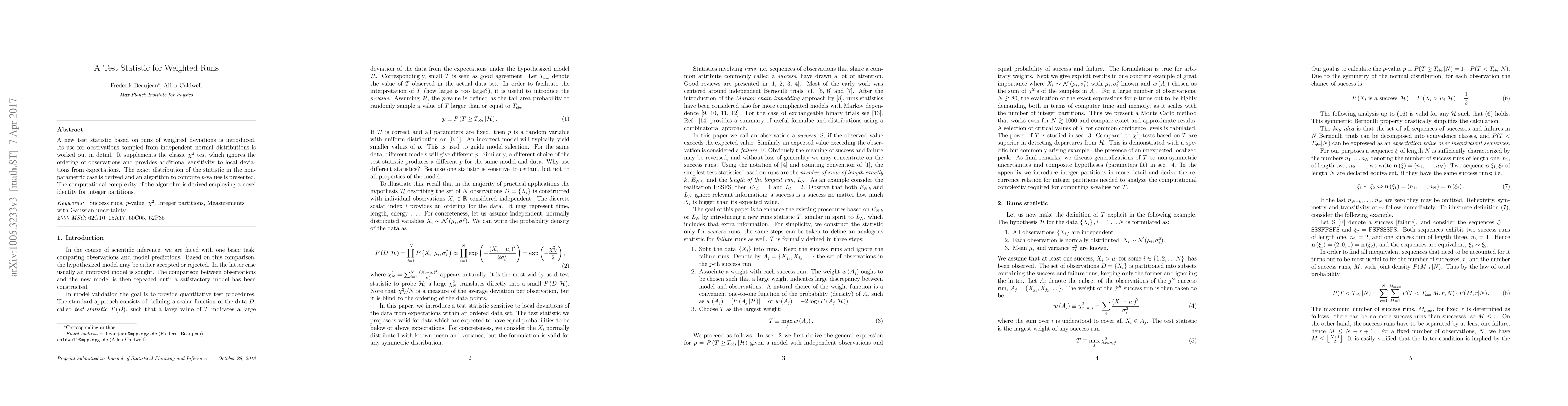 A new test statistic based on success runs of weighted deviations is introduced. Its use for observations sampled from independent normal distributions is worked out in detail. It supplements the classic $\chi^{2}$ test which ignores the ordering of observations and provides additional sensitivity to local deviations from expectations. The exact distribution of the statistic in the non-parametric case is derived and an algorithm to compute $p$-values is presented. The computational complexity of the algorithm is derived employing a novel identity for integer partitions.