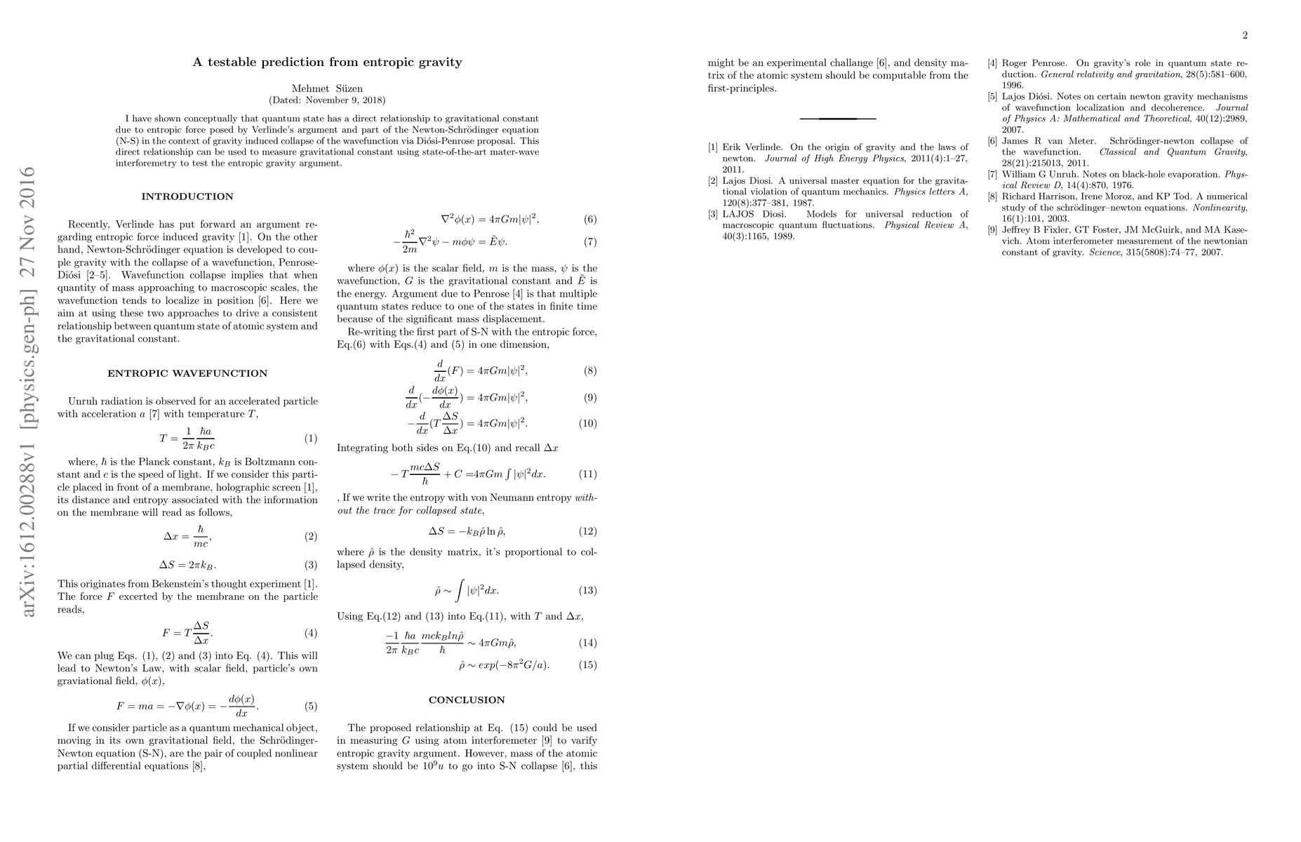 Researchers have proposed a testable method to measure gravitational constant using quantum state and matter-wave interferometry, building on Verlinde's argument about entropic force in gravity.