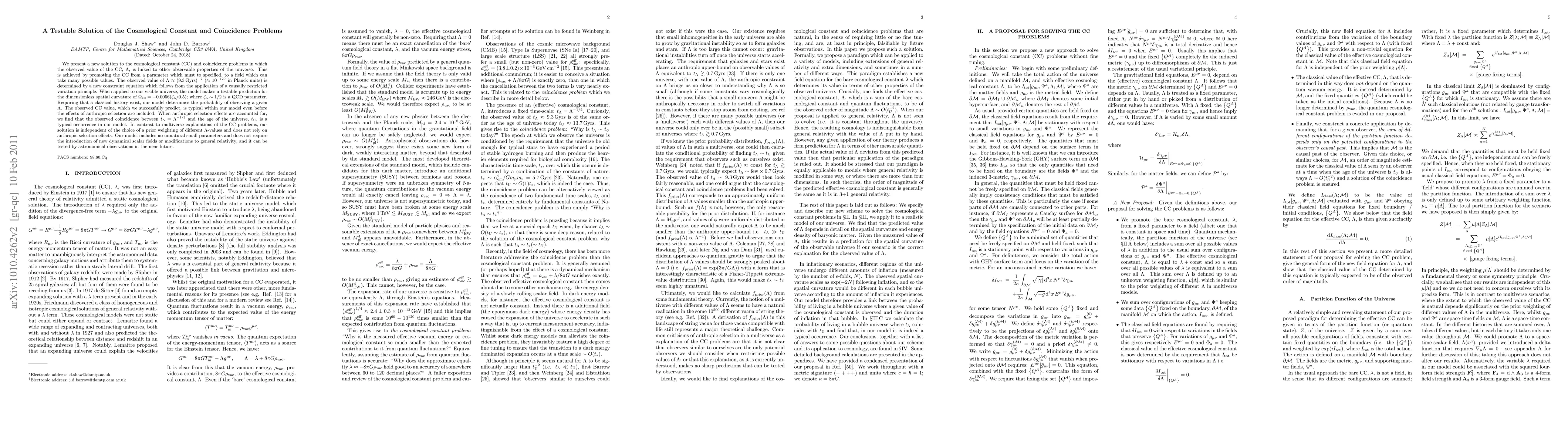 We present a new solution to the cosmological constant (CC) and coincidence problems in which the observed value of the CC, $\Lambda$, is linked to other observable properties of the universe. This is achieved by promoting the CC from a parameter which must to specified, to a field which can take many possible values. The observed value of Lambda ~ 1/(9.3 Gyrs)^2$ (approximately 10^(-120) in Planck units) is determined by a new constraint equation which follows from the application of a causally restricted variation principle. When applied to our visible universe, the model makes a testable prediction for the dimensionless spatial curvature of Omega_k0 = -0.0056 s_b/0.5; where s_b ~ 1/2 is a QCD parameter. Requiring that a classical history exist, our model determines the probability of observing a given Lambda. The observed CC value, which we successfully predict, is typical within our model even before the effects of anthropic selection are included. When anthropic selection effects are accounted for, we find that the observed coincidence between t_Lambda = Lambda^(-1/2) and the age of the universe, t_U, is a typical occurrence in our model. In contrast to multiverse explanations of the CC problems, our solution is independent of the choice of a prior weighting of different $\Lambda$-values and does not rely on anthropic selection effects. Our model includes no unnatural small parameters and does not require the introduction of new dynamical scalar fields or modifications to general relativity, and it can be tested by astronomical observations in the near future.