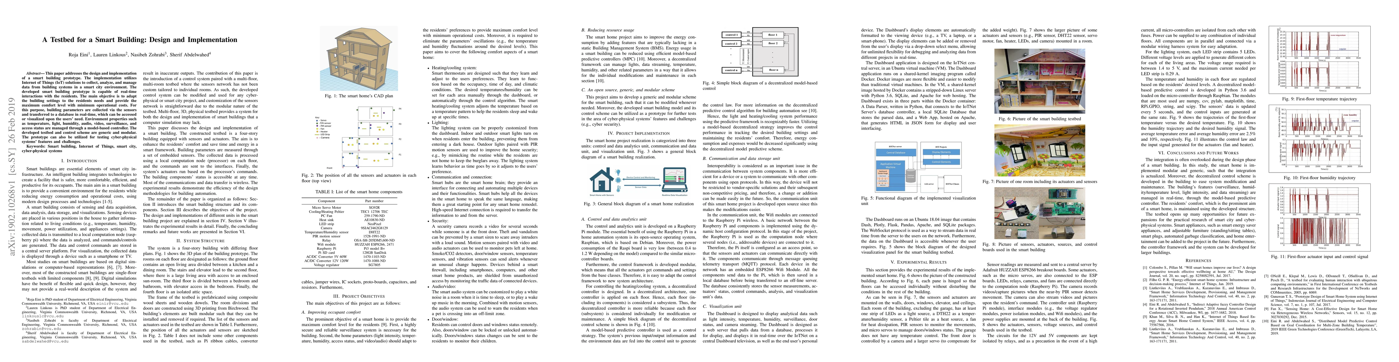 This paper details the design and implementation of a smart building prototype using IoT for real-time data collection and management, aiming to optimize resident comfort and operational costs through adaptive building settings and a modular, generic testbed for cyber-physical systems.