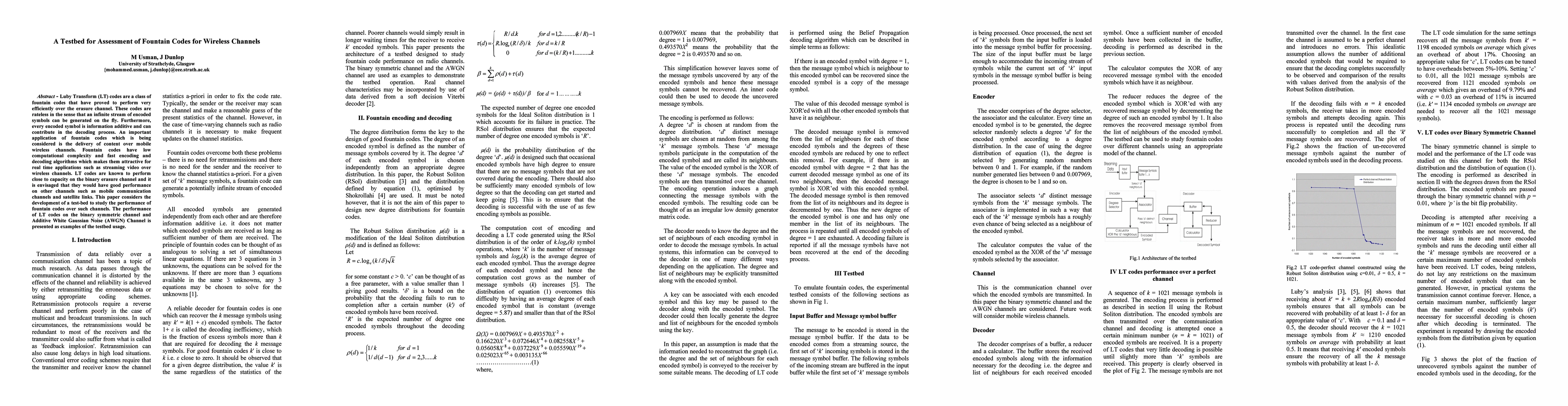 This paper develops a testbed to evaluate the performance of Luby Transform (LT) codes, a type of fountain code, over wireless channels, demonstrating their efficiency on the binary symmetric channel and Additive White Gaussian Noise (AWGN) channel. The study highlights the low computational complexity and real-time applicability of LT codes for streaming video over mobile wireless channels.