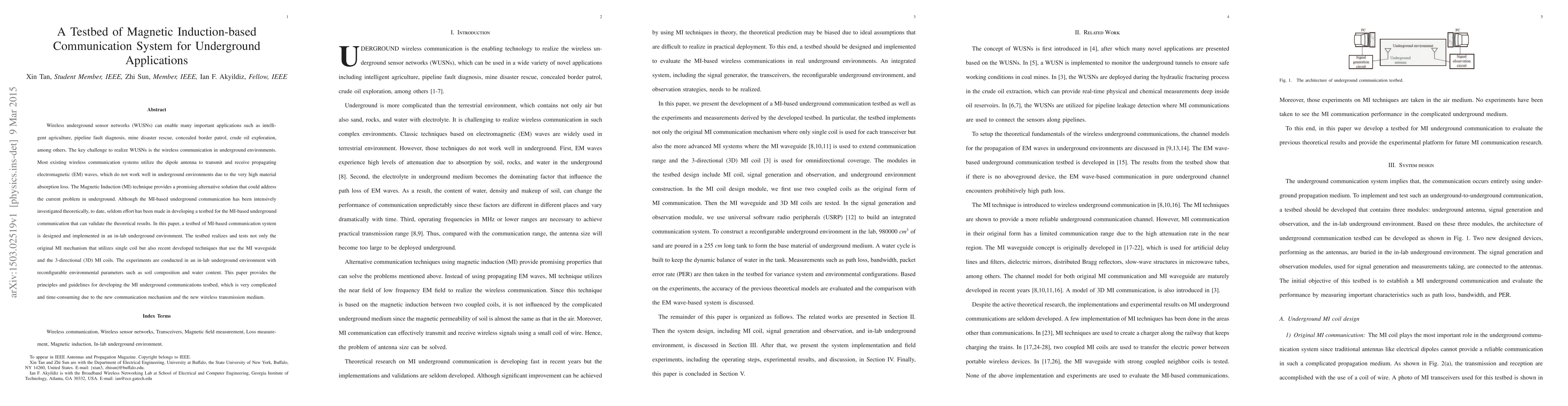This paper presents a testbed for Magnetic Induction-based communication systems designed for underground applications, addressing the challenges of wireless communication in such environments. The testbed validates theoretical MI techniques using single coils, MI waveguides, and 3D MI coils in an in-lab underground setup with adjustable soil and water conditions.