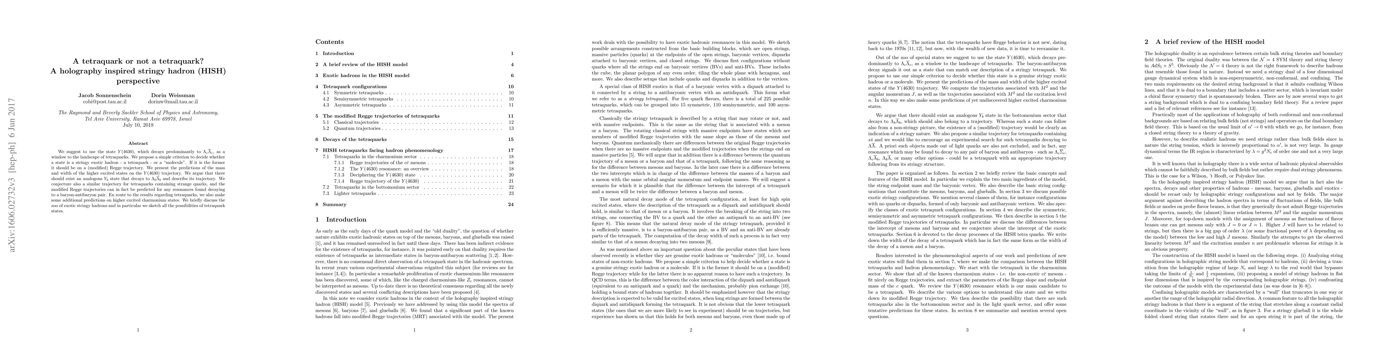 We suggest to use the state $Y(4630)$, which decays predominantly to $\Lambda_c\bar\Lambda_c$, as a window to the landscape of tetraquarks. We propose a simple criterion to decide whether a state is a genuine stringy exotic hadron - a tetraquark - or a "molecule". If it is the former it should be on a (modified) Regge trajectory. We present the predictions of the mass and width of the higher excited states on the $Y(4630)$ trajectory. We argue that there should exist an analogous "$Y_b$" state that decays to $\Lambda_b\bar\Lambda_b$ and describe its trajectory. We conjecture also a similar trajectory for tetraquarks containing strange quarks, and the modified Regge trajectories can in fact be predicted for any resonances found decaying to a baryon-antibaryon pair. En route to the results regarding tetraquarks, we also make some additional predictions on higher excited charmonium states. We briefly discuss the zoo of exotic stringy hadrons and in particular we sketch all the possibilities of tetraquark states.