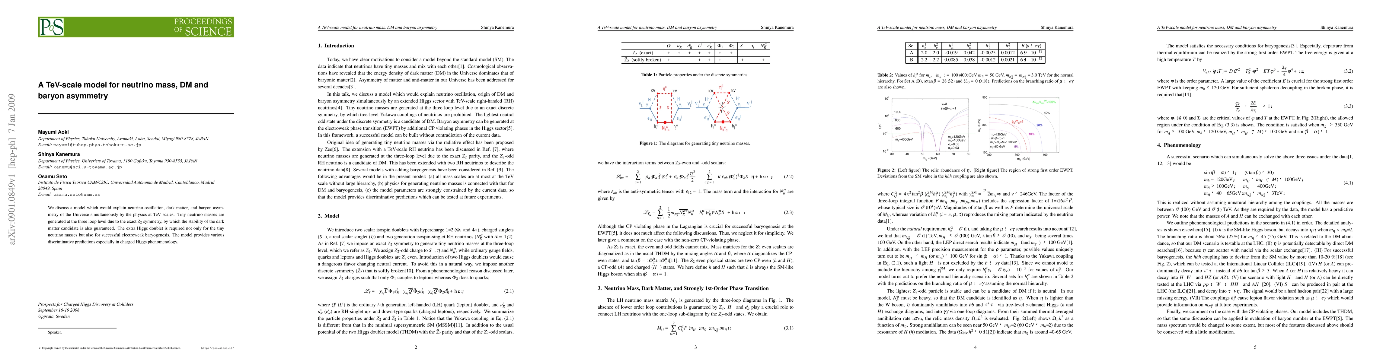 We discuss a model which would explain neutrino oscillation, dark matter, and baryon asymmetry of the Universe simultaneously by the physics at TeV scales. Tiny neutrino masses are generated at the three loop level due to the exact $Z_2$ symmetry, by which the stability of the dark matter candidate is also guaranteed. The extra Higgs doublet is required not only for the tiny neutrino masses but also for successful electroweak baryogenesis. The model provides various discriminative predictions especially in charged Higgs phenomenology.