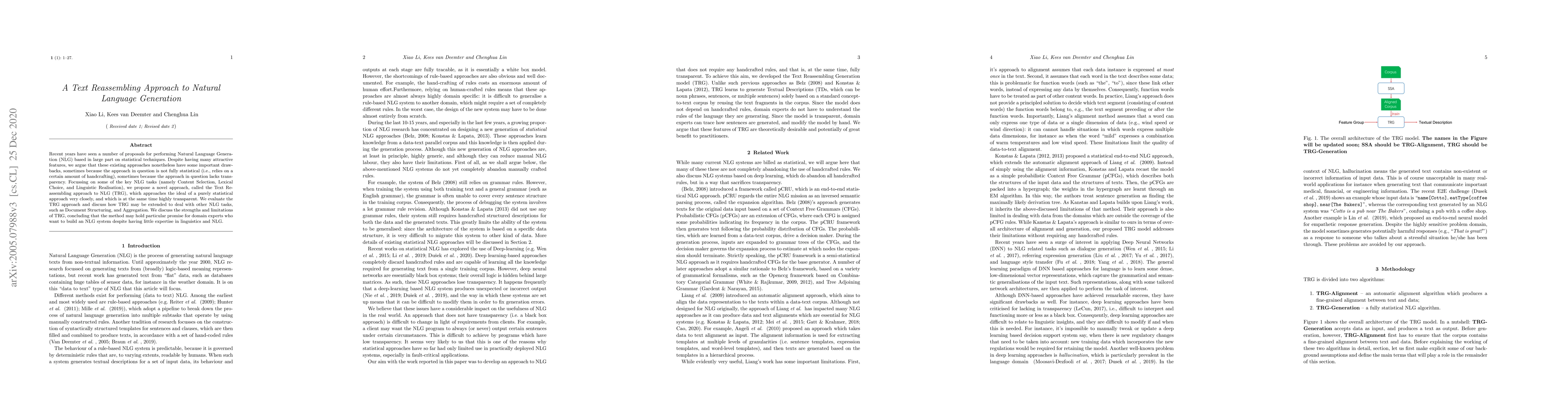 Recent years have seen a number of proposals for performing Natural Language Generation (NLG) based in large part on statistical techniques. Despite having many attractive features, we argue that these existing approaches nonetheless have some important drawbacks, sometimes because the approach in question is not fully statistical (i.e., relies on a certain amount of handcrafting), sometimes because the approach in question lacks transparency. Focussing on some of the key NLG tasks (namely Content Selection, Lexical Choice, and Linguistic Realisation), we propose a novel approach, called the Text Reassembling approach to NLG (TRG), which approaches the ideal of a purely statistical approach very closely, and which is at the same time highly transparent. We evaluate the TRG approach and discuss how TRG may be extended to deal with other NLG tasks, such as Document Structuring, and Aggregation. We discuss the strengths and limitations of TRG, concluding that the method may hold particular promise for domain experts who want to build an NLG system despite having little expertise in linguistics and NLG.