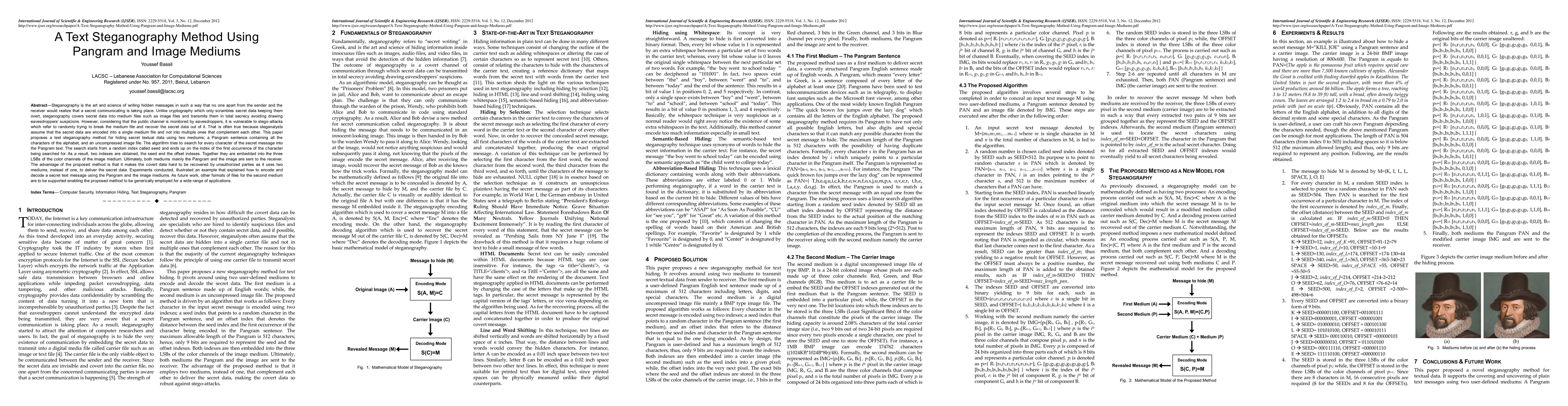 Steganography is the art and science of writing hidden messages in such a way that no one apart from the sender and the receiver would realize that a secret communicating is taking place. Unlike cryptography which only scrambles secret data keeping them overt, steganography covers secret data into medium files such as image files and transmits them in total secrecy avoiding drawing eavesdroppers suspicions. However, considering that the public channel is monitored by eavesdroppers, it is vulnerable to stego-attacks which refer to randomly trying to break the medium file and recover the secret data out of it. That is often true because steganalysts assume that the secret data are encoded into a single medium file and not into multiple ones that complement each other. This paper proposes a text steganography method for hiding secret textual data using two mediums; a Pangram sentence containing all the characters of the alphabet, and an uncompressed image file. The algorithm tries to search for every character of the secret message into the Pangram text. The search starts from a random index called seed and ends up on the index of the first occurrence of the character being searched for. As a result, two indexes are obtained, the seed and the offset indexes. Together they are embedded into the three LSBs of the color channels of the image medium. Ultimately, both mediums mainly the Pangram and the image are sent to the receiver. The advantage of the proposed method is that it makes the covert data hard to be recovered by unauthorized parties as it uses two mediums, instead of one, to deliver the secret data. Experiments conducted, illustrated an example that explained how to encode and decode a secret text message using the Pangram and the image mediums.