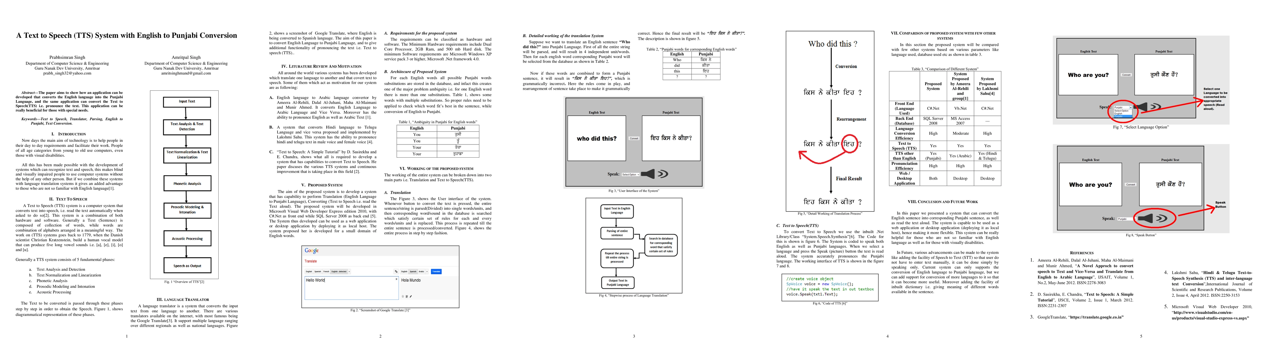 Summary: This paper presents a Text to Speech (TTS) system that converts English text into Punjabi, aiding individuals with special needs by providing spoken Punjabi output from written English input. The application's dual functionality enhances accessibility and communication.