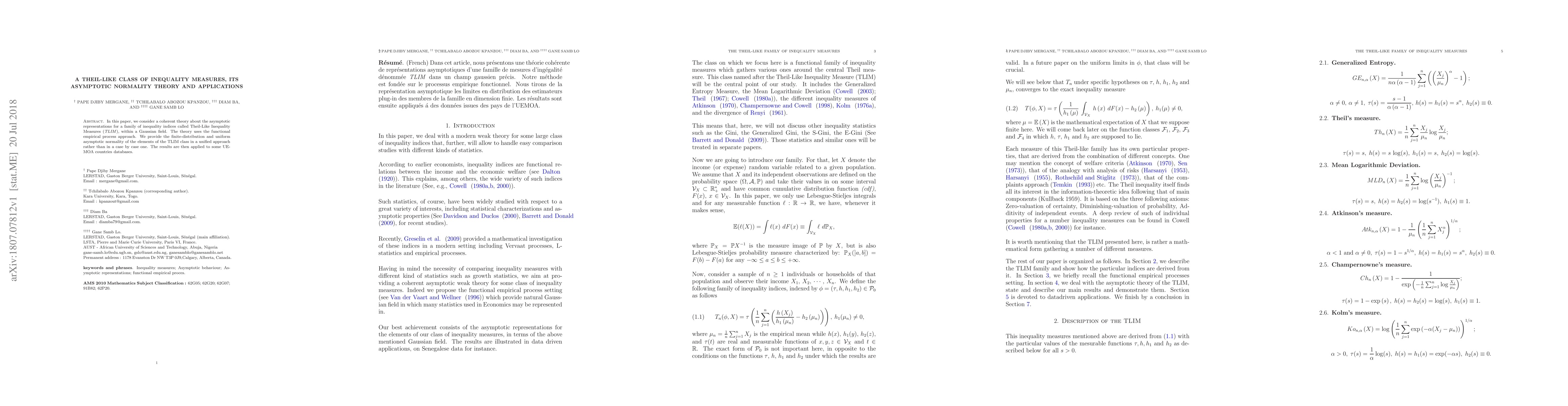 In this paper, we consider a coherent theory about the asymptotic representations for a family of inequality indices called Theil-Like Inequality Measures (TLIM), within a Gaussian field. The theory uses the functional empirical process approach. We provide the finite-distribution and uniform asymptotic normality of the elements of the TLIM class in a unified approach rather than in a case by case one. The results are then applied to some UEMOA countries databases.