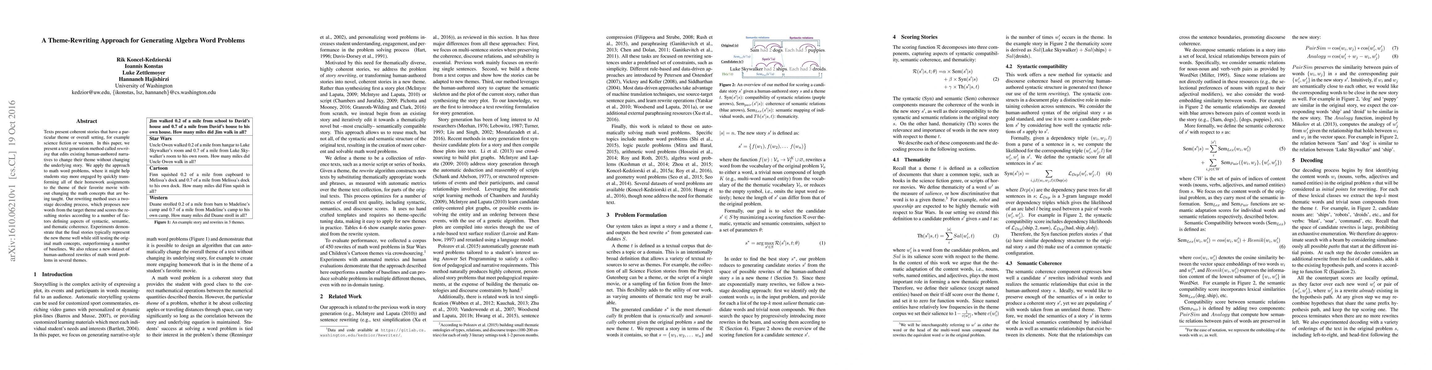 This paper introduces a theme-rewriting method for generating algebra word problems that adapts existing narratives to new themes while preserving the original math concepts. The approach uses a two-stage decoding process to ensure syntactic, semantic, and thematic coherence, and experiments show it outperforms baselines.