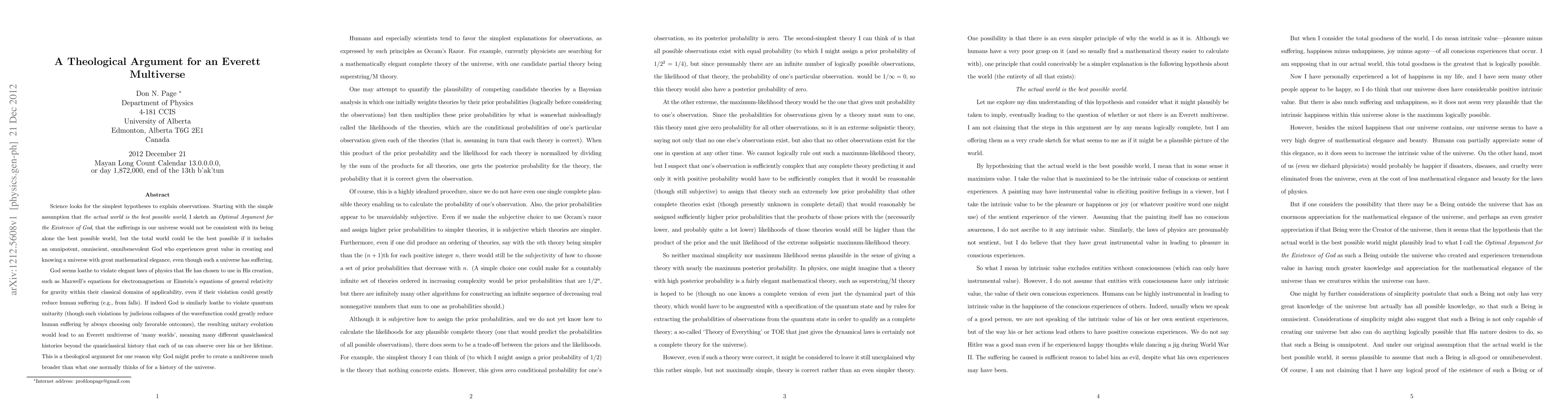 Science looks for the simplest hypotheses to explain observations. Starting with the simple assumption that {\em the actual world is the best possible world}, I sketch an {\it Optimal Argument for the Existence of God}, that the sufferings in our universe would not be consistent with its being alone the best possible world, but the total world could be the best possible if it includes an omnipotent, omniscient, omnibenevolent God who experiences great value in creating and knowing a universe with great mathematical elegance, even though such a universe has suffering. God seems loathe to violate elegant laws of physics that He has chosen to use in His creation, such as Maxwell's equations for electromagnetism or Einstein's equations of general relativity for gravity within their classical domains of applicability, even if their violation could greatly reduce human suffering (e.g., from falls). If indeed God is similarly loathe to violate quantum unitarity (though such violations by judicious collapses of the wavefunction could greatly reduce human suffering by always choosing only favorable outcomes), the resulting unitary evolution would lead to an Everett multiverse of `many worlds', meaning many different quasiclassical histories beyond the quasiclassical history that each of us can observe over his or her lifetime. This is a theological argument for one reason why God might prefer to create a multiverse much broader than what one normally thinks of for a history of the universe.