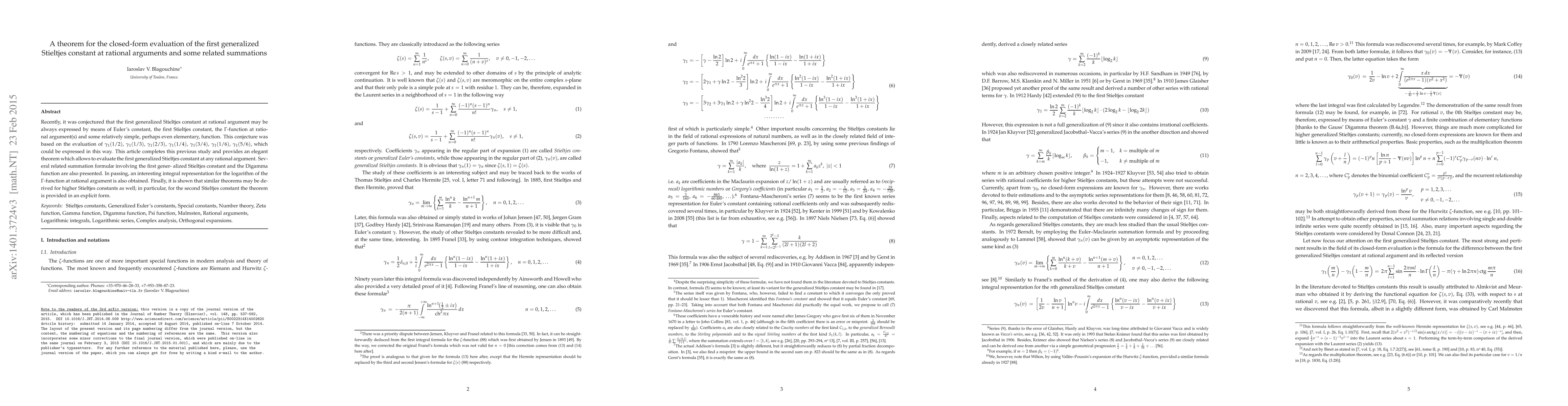 Recently, it was conjectured that the first generalized Stieltjes constant at rational argument may be always expressed by means of Euler's constant, the first Stieltjes constant, the $\Gamma$-function at rational argument(s) and some relatively simple, perhaps even elementary, function. This conjecture was based on the evaluation of $\gamma_1(1/2)$, $\gamma_1(1/3)$, $\gamma_1(2/3)$, $\gamma_1(1/4)$, $\gamma_1(3/4)$, $\gamma_1(1/6)$, $\gamma_1(5/6)$, which could be expressed in this way. This article completes this previous study and provides an elegant theorem which allows to evaluate the first generalized Stieltjes constant at any rational argument. Several related summation formul{\ae} involving the first generalized Stieltjes constant and the Digamma function are also presented. In passing, an interesting integral representation for the logarithm of the $\Gamma$-function at rational argument is also obtained. Finally, it is shown that similar theorems may be derived for higher Stieltjes constants as well; in particular, for the second Stieltjes constant the theorem is provided in an explicit form.