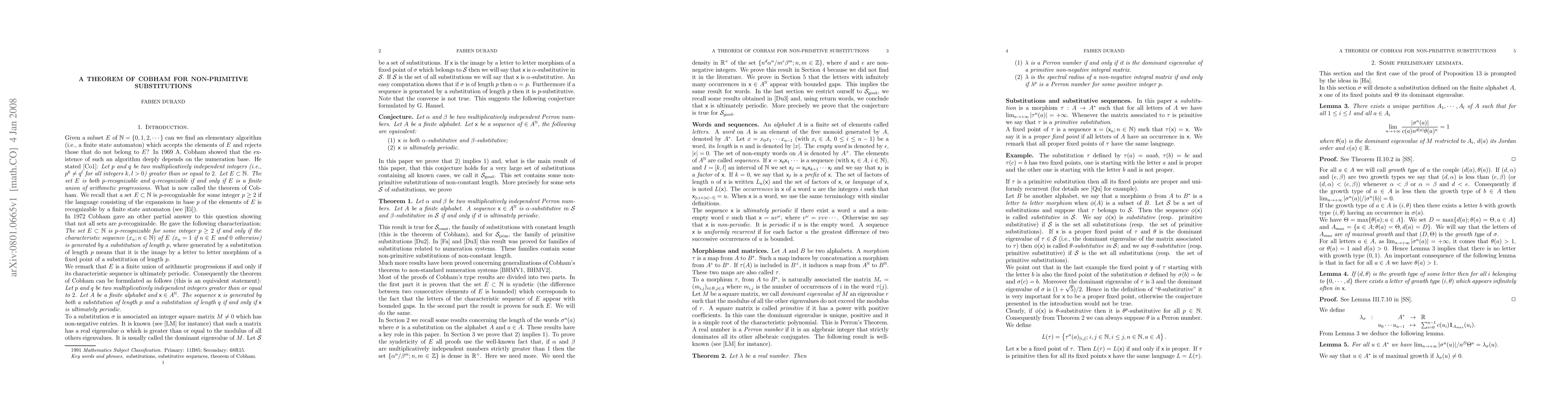 This paper generalizes Cobham's theorem to include a broad range of substitutions, encompassing non-primitive and non-constant length cases, expanding the original scope of the theorem.
