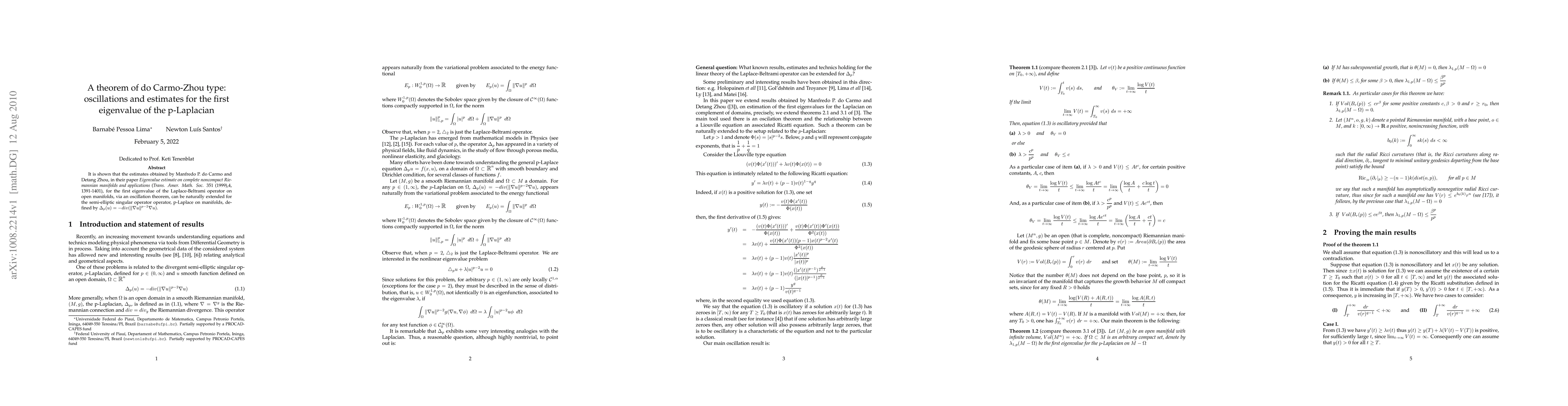 It is shown that the estimates obtained by Manfredo P. do Carmo and Detang Zhou, in their paper "Eigenvalue estimate on complete noncompact Riemannian manifolds and applications", for the first eigenvalue of the Laplace-Beltrami operator on open manifolds, via an oscillation theorem, can be naturally extended for the semi-elliptic singular operator operator, p-Laplace on manifolds.