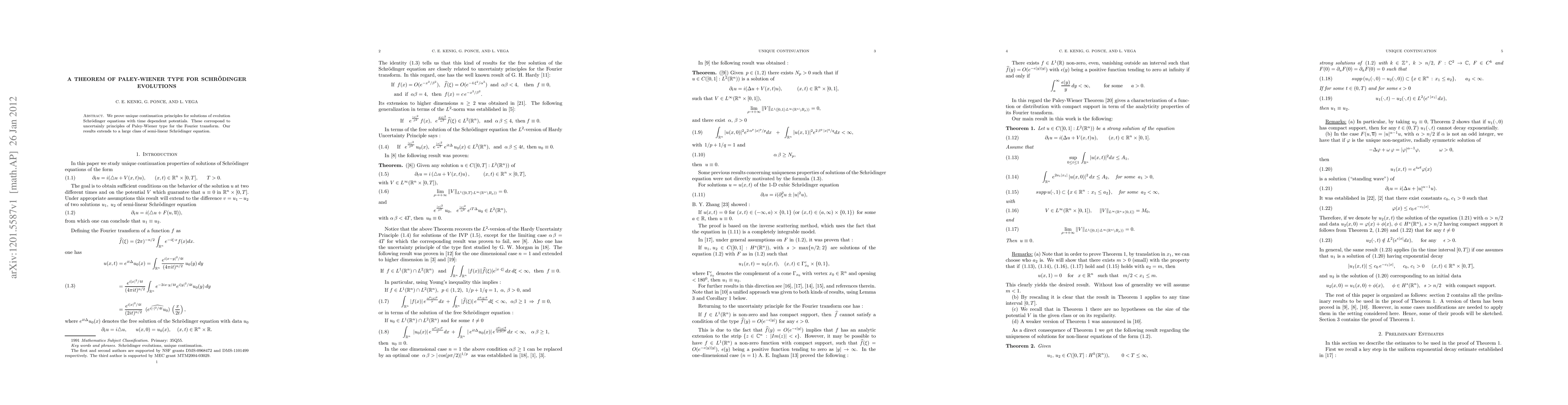 We prove unique continuation principles for solutions of evolution Schr\"odinger equations with time dependent potentials. These correspond to uncertainly principles of Paley-Wiener type for the Fourier transform. Our results extends to a large class of semi-linear Schr\"odinger equation.