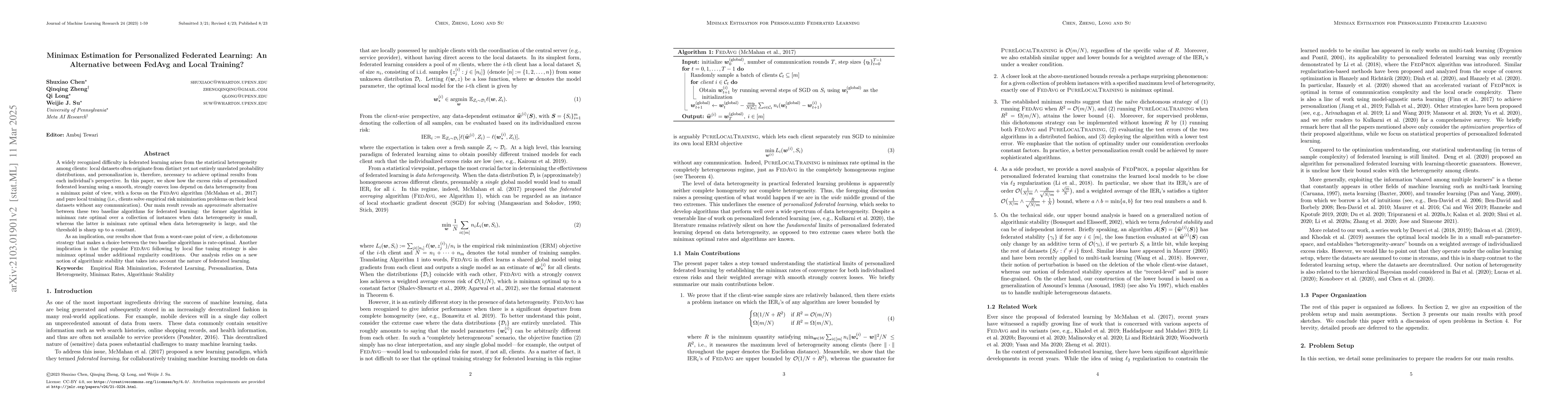 This paper presents a theorem of the alternative for personalized federated learning, demonstrating that the optimal approach depends on data heterogeneity. It shows that FedAvg is minimax optimal when heterogeneity is below a threshold, while pure local training is better when heterogeneity exceeds it.