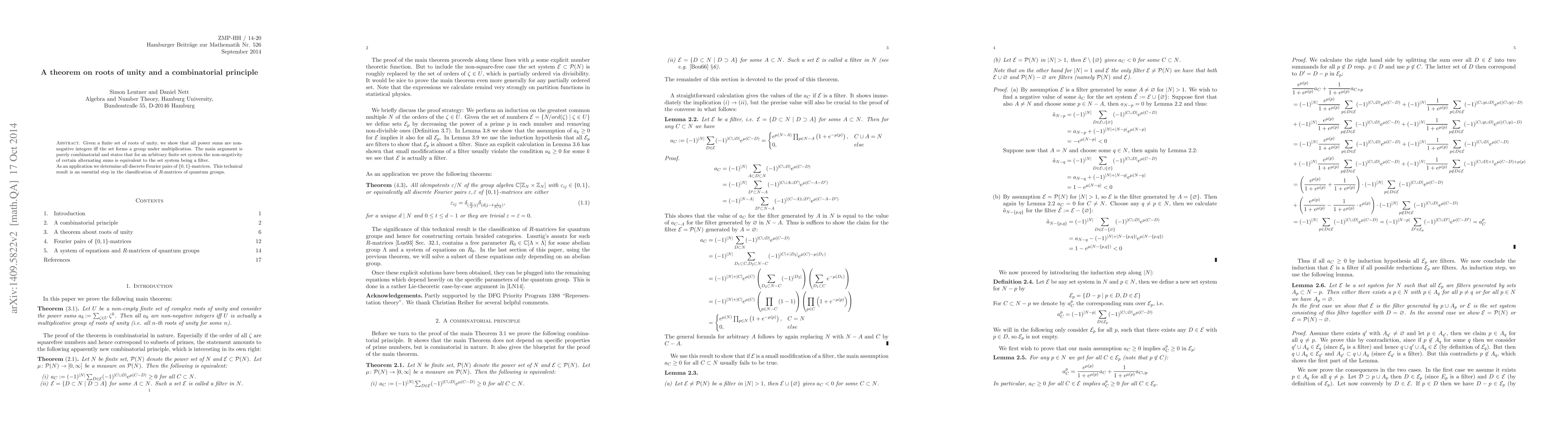 Given a finite set of roots of unity, we show that all power sums are non-negative integers iff the set forms a group under multiplication. The main argument is purely combinatorial and states that for an arbitrary finite set system the non-negativity of certain alternating sums is equivalent to the set system being a filter. As an application we determine all discrete Fourier pairs of $\{0,1\}$-matrices. This technical result is an essential step in the classification of $R$-matrices of quantum groups.