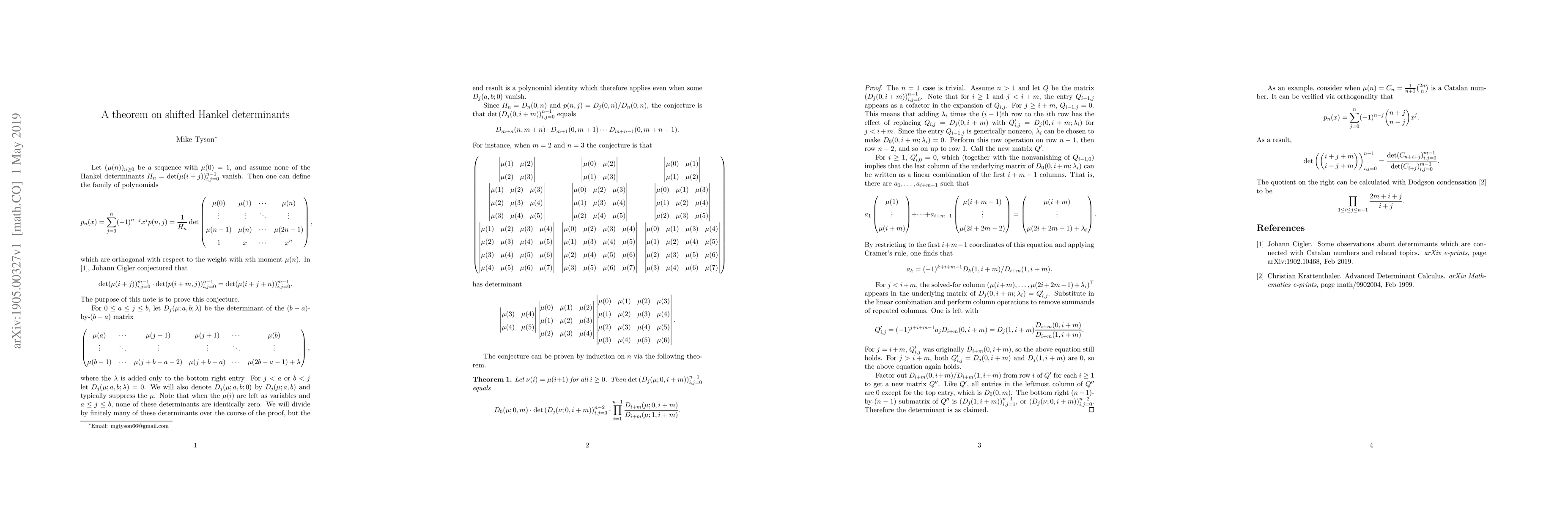 We prove a conjecture of Johann Cigler on shifted Hankel determinants.