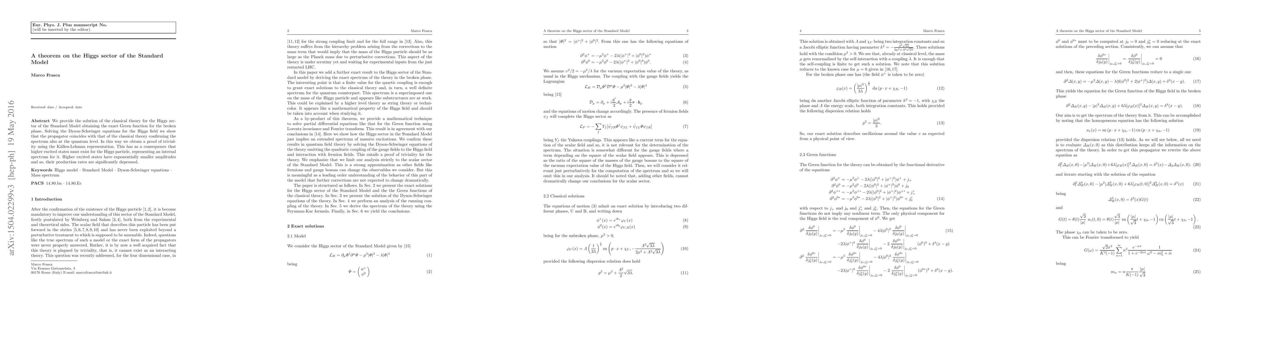 We provide the solution of the classical theory for the Higgs sector of the Standard Model obtaining the exact Green function for the broken phase. Solving the Dyson-Schwinger equations for the Higgs field we show that the propagator coincides with that of the classical theory confirming the spectrum also at the quantum level. In this way we obtain a proof of triviality using the K\"allen-Lehman representation. This has as a consequence that higher excited states must exist for the Higgs particle, representing an internal spectrum for it. Higher excited states have exponentially smaller amplitudes and so, their production rates are significantly depressed.
